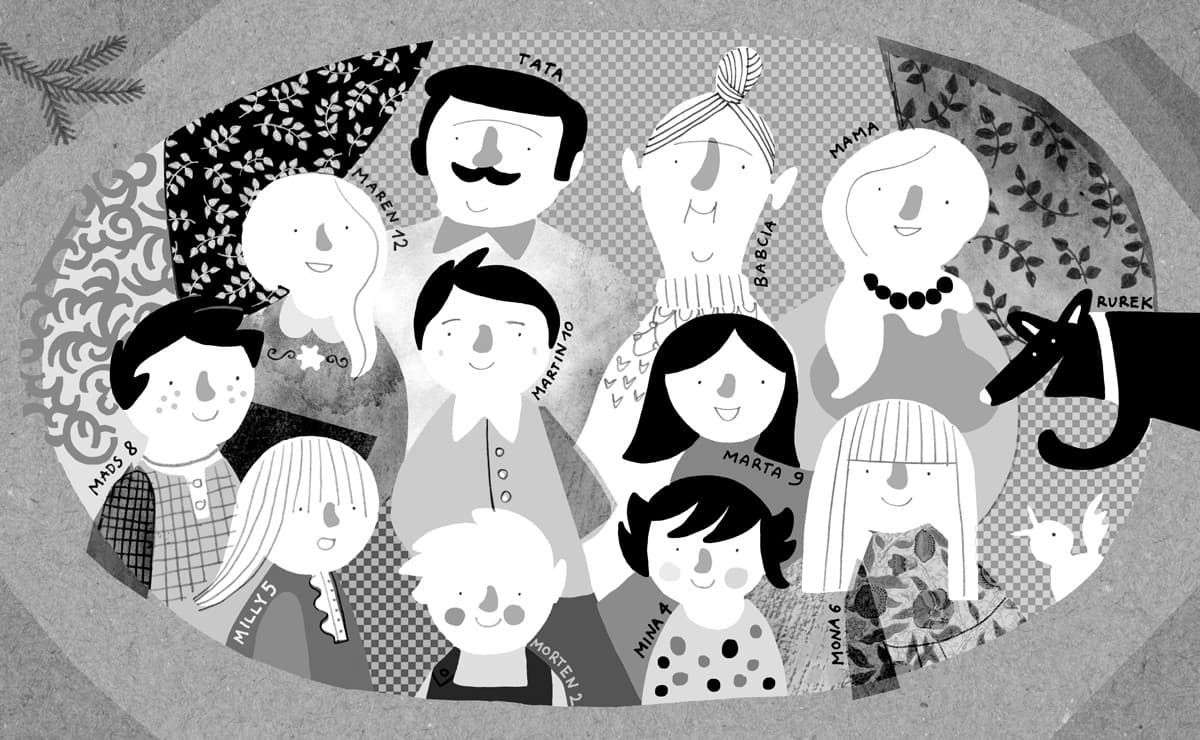 Nowe przygody bohaterów „8 + 2 i ciężarówka” – najpopularniejszej norweskiej książki dla dzieci. Co to: aż jedenaście par śladów na śniegu przed domkiem w lesie? Właśnie wprowadzili się tutaj mama, tata i ośmioro dzieci: Maren, Martin, Marta, Mads, Mona, Milly, Mina i mały Morten. A razem z nimi – babcia. Teraz to najweselszy dom w całej Norwegii! Dzieci godzinami bawią się w chowanego, mama niespodziewanie ma czas na czytanie książek, tata wspina się na najwyższe drzewo ze swoim puzonem. A babcia? Trenuje skoki narciarskie, otwiera własny sklep i walczy z Indianami!