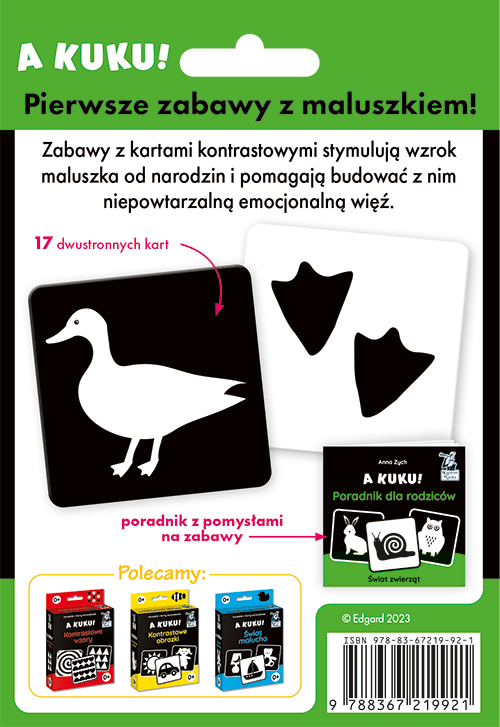 A kuku! Świat zwierząt (0–18 miesięcy) to zestaw zabaw stymulujących wzrok niemowląt już od narodzin. Zawiera 17 kart zwierząt w dwóch wersjach: czarno-białej i biało-czarnej oraz poradnik dla opiekunów ze wskazówkami pedagoga, jak rozwija się zmysł wzroku u dzieci, oraz pomysłami na twórcze zabawy z kartami, które można wykorzystywać na wiele sposobów, tak aby ćwiczyć wzrok, a jednocześnie budować niepowtarzalną więź opiekuna z dzieckiem. Zabawy stymulujące wzrok oraz wspierające rozwój społeczno-emocjonalny Zestaw A kuku! Świat zwierząt (0–18 miesięcy) zawiera poradnik dla opiekunów oraz 17 kart obrazkowych. Na kartach znajdują się czarno-białe i biało-czarne rysunki zwierząt, ich tropów, łat i wzorów. Karty pomagają ćwiczyć wzrok malucha, który dopiero się rozwija, a także wspomagają rozwój mowy u starszych dzieci. Rysunki zwierząt, zwłaszcza tych często spotykanych w domach, takich jak kot, pies czy królik, mogą stać się pretekstem do nauki pierwszych słów, nazywania i rozpoznawania otaczającego malucha świata. Poradnik dla opiekunów, opracowany przez Annę Zych, pedagoga i terapeutę, zawiera pomysły na zabawy i gry z kartami umilające wspólnie spędzony czas. A kuku! to edukacyjna seria wspierająca rozwój dzieci już od pierwszych dni życia. Publikacje z tej serii zostały wyprodukowane w Polsce z najwyższą troską o bezpieczeństwo najmłodszych. Rozwój spostrzeganie wzrokowe, rozwój mowy, poznawanie świata, koordynacja oko-ręka Autorzy Anna Zych – pedagog specjalny, terapeuta pedagogiczny z ponad 20-letnim stażem, pracownik poradni psychologiczno-pedagogicznej, doradca metodyczny, wykładowca na kursach kwalifikacyjnych terapii pedagogicznej. Pola Augustynowicz – ilustratorka i graficzka, obecnie mieszka i pracuje w Warszawie. Studiowała na Uniwersytecie Artystycznym w Poznaniu i dziennikarstwo na Uniwersytecie Adama Mickiewicza. Projektuje książki, tekstylia, opakowania, współpracuje z magazynami. Laureatka licznych konkursów graficznych i biennale.