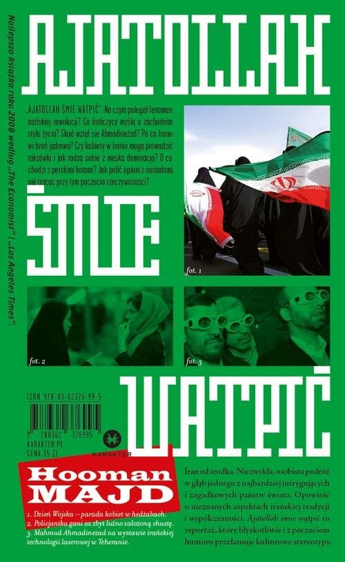 Iran od środka. Niezwykła, osobista podróż w głąb jednego z najbardziej intrygujących i zagadkowych państw świata. Zapierająca dech w piersiach opowieść o nieznanych aspektach irańskiej tradycji i współczesności. Na czym polegał fenomen irańskiej rewolucji i dlaczego Irańczycy zbuntowali się przeciw zachodniemu stylowi życia? Skąd wziął się Ahmadineżad? Po co Iranowi broń jądrowa i jakie były kulisy konferencji negującej Holokaust? Czy kobiety w Iranie mogą prowadzić taksówki i jak radzą sobie z męską dominacją? O co chodzi z perskimi kotami? Jak palić opium z sąsiadami, nie tracąc przy tym poczucia rzeczywistości? Te i inne tajniki irańskiej kultury i polityki ujawnia w swej książce Hooman Majd, syn irańskiego ambasadora w Stanach Zjednoczonych, wnuk jednego z ważnych irańskich ajatollahów. Jako Irańczyk może dotrzeć do miejsc niedostępnych dla turystów i zachodnich reporterów. Jako człowiek wykształcony na Zachodzie wie, jak opisać swój kraj, by stał się on bardziej zrozumiały dla ludzi z zewnątrz. Robi to z pasją, ale też z dystansem i szalonym poczuciem humoru, które sprawiają, że książkę czyta się jednym tchem. To jeden z najbardziej odkrywczych i przełamujących stereotypy reportaży, jakie powstały w ciągu ostatnich lat. Najlepsza książka roku 2008 według „The Economist” i „Los Angeles Times”. Książka znalazła się w 2008 roku na liście bestsellerów „New York Timesa”. Hooman Majd, urodzony w Teheranie w 1957 roku, syn dyplomaty rządu szacha, wnuk jednego z irańskich ajatollahów, uczęszczał do szkół w Wielkiej Brytanii i Stanach Zjednoczonych. Przez wiele lat pracował w przemyśle muzycznym w Los Angeles, pozostając w nieustannym kontakcie z rodzinnym krajem i często do niego wracając. W 2009 roku był tłumaczem Ahmadineżada w ONZ, pracował jako tłumacz i doradca prezydenta Chatamiego. Mieszka w Nowym Jorku, publikuje w najważniejszych amerykańskich pismach, jak „The New York Times”, „The New Yorker”, „Newsweek”. Podwójna – zachodnia i bliskowschodnia – perspektywa wyróżnia go spośród licznych dziennikarzy i reporterów próbujących analizować irańską rzeczywistość. Osobiste kontakty zarówno z elitami, jak i zwykłymi ludźmi oraz częste wizyty w rodzinnym kraju pozwalają mu pisać o Iranie tak, jak nie robił tego dotąd nikt inny