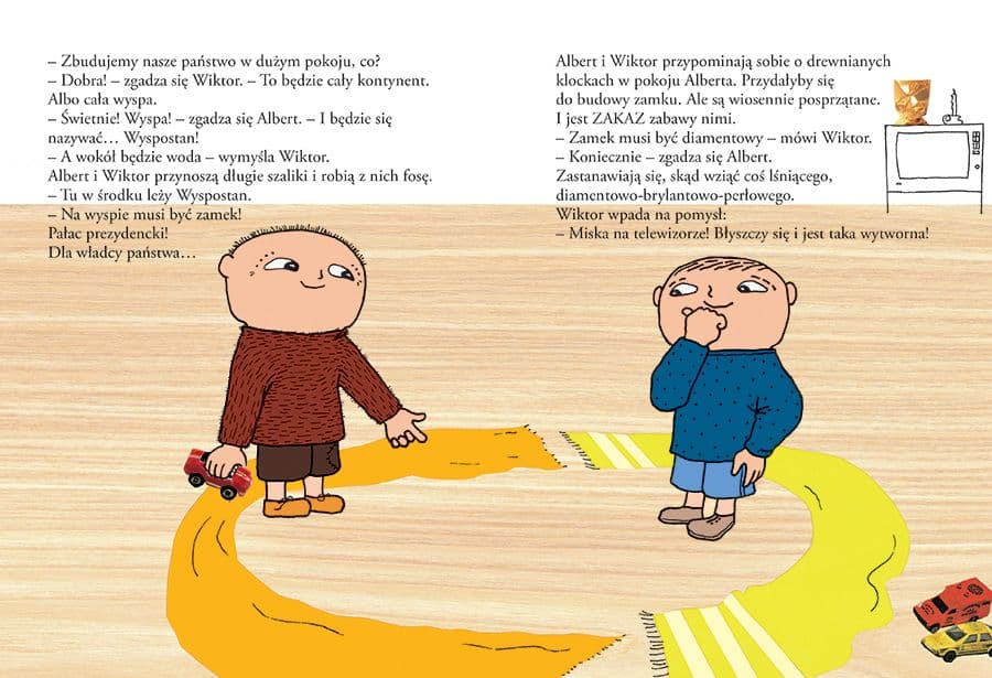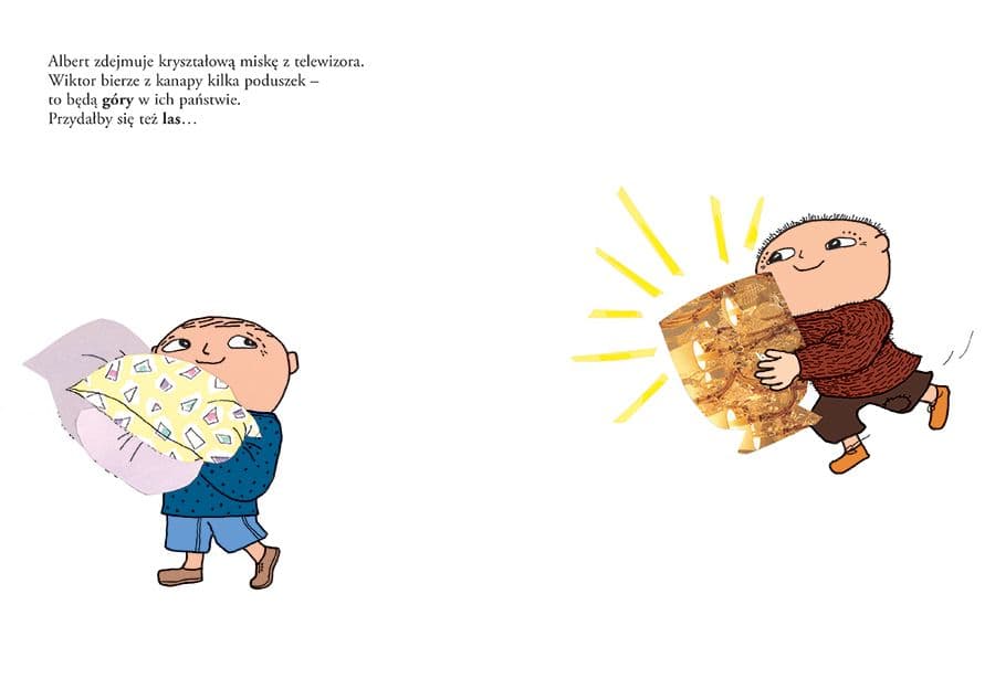 Albert i Wiktor chcą się pobawić, ale nie wolno im wyciągać zabawek! Tata Alberta posprzątał dziś całe mieszkanie i nie chce, żeby znowu zrobił się bałagan. Albert i Wiktor nie przejmują się tym – potrafią się bawić bez zabawek w zabawy, których prawie nie widać. W każdym razie nie widzą ich tatusiowie… Albert Albertson mieszka z bardzo miłym tatą i kotem Puzlem. Jak każdy kilkulatek czasem ma problemy z zasypianiem, potrafi rano strasznie się grzebać przed wyjściem do przedszkola i jest niezwykle pomysłowy, zwłaszcza jeśli bardzo czegoś chce. Dzieci rozpoznają w Albercie swoje zachowania i emocje – radość zabawy, ciekawość świata, nieograniczoną fantazję, ale też złość, zazdrość czy strach. Książki o Albercie, tłumaczone na 40 języków i dialektów, rozeszły się dotąd w dziesięciomilionowym nakładzie w Szwecji i poza jej granicami, a na ich kanwie powstały liczne spektakle teatralne i filmy animowane. W Szwecji to już kultowa seria, licząca ponad trzydzieści tytułów. Jej autorka i ilustratorka, Gunilla Bergström, otrzymała za swoją twórczość wiele nagród i wyróżnień, włącznie z wyborem jej książki na książkę roku 1997 przez szwedzkie Jury Dziecięce. W 2012 roku uhonorowana została przez szwedzki rząd medalem Illis quorum za „nowatorską twórczość literacką i ilustratorską znakomicie ukazującą świat z dziecięcej perspektywy”. W 2022 roku minęło 50 lat od ukazania się pierwszej historii o Albercie Albertsonie, który w Szwecji nazywa się Alfons Åberg. Książki o tym bohaterze cieszą się w Szwecji niesłabnącą popularnością, a w Polsce szybko zdobywają kolejnych wiernych czytelników.