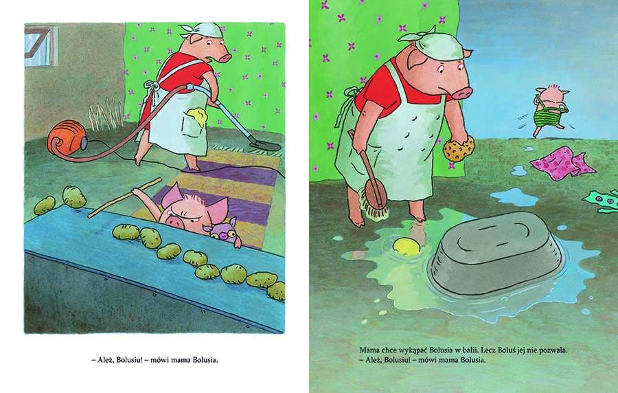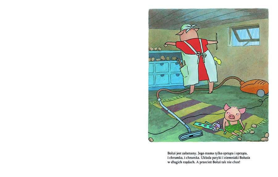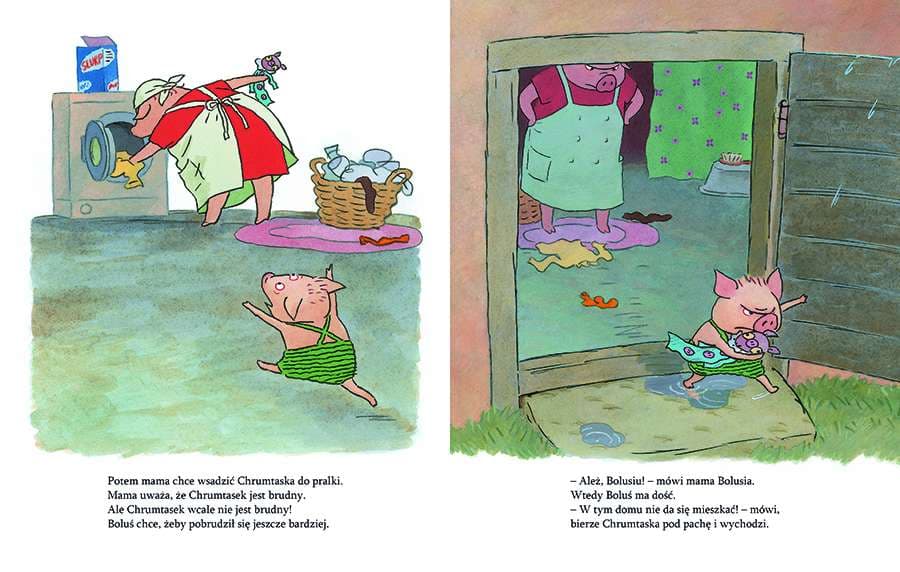 Boluś jest załamany. Jego mama tylko sprząta i sprząta, i chrumka, i chrumka. Układa patyki i ziemniaki Bolusia w długich rzędach. Chce wykąpać Bolusia w balii, a Chrumtaska wsadzić do pralki. Boluś nie wytrzymuje. Bierze Chrumtaska pod pachę i wyprowadza się z domu. Obrazkowa trylogia o upartym prosiaczku Bolusiu należy do wpółczesnej szwedzkiej klasyki książek dla dzieci. Barbro Lindgren, tegoroczna laureatka Nagrody im. Astrid Lindgren (ALMA), którą znamy z książeczek o Maksie, oraz genialnie rysujący emocje Olof Landström niejednego rozbawią do łez swoim portretem dwulatka.