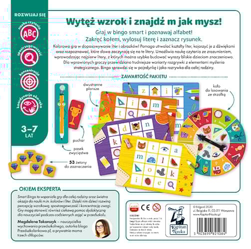 Gra edukacyjna „Alfabet. Smart Bingo” (3–7 lat) Kapitana Nauki to ekscytująca gra z kołem losującym, która wprowadza przedszkolaki w świat liter. Dzięki aktywnej formie nauki dzieci uczą się rozpoznawać litery, odróżniać ich kształt od innych znaków oraz łączyć je z odpowiadającym im dźwiękiem i znaczeniem wyrazu rozpoczynającego się daną literą. Rozwijają przy tym percepcję wzrokową i słuchową oraz spostrzegawczość. To doskonały trening przygotowujący dzieci do nauki czytania. Rozwijanie słownictwa i wyobraźni językowej Smart Bingo to wspaniałe gry dla całej rodziny oraz świetna okazja do nauki m.in. kolorów i liter. Dzięki nim dzieci rozwiną percepcje wzrokową, spostrzegawczość i koncentrację uwagi. Gry mogą stanowić również ciekawą pomoc dydaktyczną dla nauczycieli podczas codziennych zajęć w przedszkolu. Magdalena Tokarczyk – nauczycielka wychowania przedszkolnego, autorka bloga Przedszkolankowo.pl, a prywatnie mama trzech chłopców. B jak but, u jak ul, z jak zegar! Gra edukacyjna „Alfabet. Smart Bingo” (3–7 lat) to żywiołowa rozrywka, podczas której przedszkolaki poznają i zapamiętują litery oraz wyrazy rozpoczynające się konkretną literą i ich znaczenia. Gra Kapitana Nauki opiera się na zasadach dobrze znanej gry bingo – trzeba znaleźć i zaznaczyć na swojej planszy litery lub obrazki wylosowane na kole losującym. Wygrywa ten, kto pierwszy zapełni cztery sąsiadujące pola na planszy (w pionie, poziomie lub po skosie). Wersja trudniejsza rozwija również umiejętność myślenia strategicznego, można bowiem zaznaczyć tylko jedno pole z literą lub rysunkiem z dwóch pasujących elementów. „Alfabet. Smart Bingo” to świetna gra rodzinna, która zapewni wszystkim uczestnikom dobrą zabawę. O fantastyczną oprawę graficzną zadbał Krzysztof Stręcioch. Jego kolorowe i niepowtarzalne rysunki ułatwią przedszkolakom zapamiętanie liter polskiego alfabetu. Plansze, żetony i koło losujące zostały wykonane z grubej tektury, co gwarantuje bezpieczną zabawę oraz wytrzymałość nawet podczas najbardziej emocjonujących rozgrywek. Rozwój nauka czytania, spostrzegawczość, koncentracja, koordynacja oko-ręka Autorzy Izabela Gołaszewska – redaktorka, entuzjastka mądrych zabawek i ilustracji dla dzieci. Krzysztof Stręcioch – zajmuje się tworzeniem ilustracji oraz projektowaniem graficznym. Jest absolwentem Akademii Sztuk Pięknych w Katowicach. Jego artystyczny dorobek stale się powiększa. Najbardziej dumny jest z ilustracji do książek dla dzieci. Wolny czas spędza aktywnie, co motywuje i inspiruje go do podejmowania kolejnych twórczych wyzwań. W serii również Gra edukacyjna. Litera do litery Gra edukacyjna. Sylaba do sylaby Układanka literowa. Czytam i układam słowa Układanka sylabowa. Czytam i układam sylaby Gra edukacyjna. Alfabet na 3 sposoby