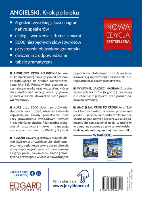 Chcesz swobodnie mówić po angielsku w codziennych sytuacjach? Potrzebujesz osłuchać się z językiem, by w końcu poradzić sobie w rozmowach w języku angielskim? Angielski od poziomu początkującego do średnio zaawansowanego z jednym kursem? Tak, to możliwe! Jeśli szukasz kursu, który poprowadzi cię od poziomu początkującego do poziomu średnio zaawansowanego, sprawdź Angielski Krok po kroku.To kompletny kurs językowy, dzięki któremu przejdziesz krok po kroku od poziomu podstawowego A1 do poziomu średnio zaawansowanego B1. To zestaw dwóch książek wraz z nagraniami do pobrania dla zaczynających naukę języka, a także dla tych, którzy chcieliby odświeżyć znajomość języka angielskiego w szybki, przejrzysty i praktyczny sposób. ANGIELSKI I KROK PO KROKU to: ponad 3000 słów i zwrotów kluczowych w każdej sytuacji klarowne objaśnienia podstawowych zagadnień gramatycznych nagrania profesjonalnych lektorów i native speakerów ciekawostki o kulturze ćwiczenia z kluczem odpowiedzi W zestawie znajdziesz 3000 niezbędnych słów i zwrotów na poziomie A1–B1, które wykorzystasz podczas rozmów po angielsku lub podczas pobytu zagranicą. Teraz już samodzielnie zapytasz o drogę, zrobisz zakupy, zamówisz kawę czy herbatę i bez problemu poradzisz sobie w każdej codziennej sytuacji! Wysokiej jakości nagrania (aż 6 godzin) pozwalają osłuchać się z językiem, poznać jego melodię oraz prawidłową wymowę. Wszystkie słówka, zwroty oraz dialogi wraz z tłumaczeniami zostały udźwiękowione przez profesjonalnych lektorów. Uczysz się bez konieczności zaglądania do książki! W Angielski Krok po kroku znajdziesz przejrzyście opisane zasady gramatyki języka angielskiego, dzięki którym szybko opanujesz niezbędne zagadnienia gramatyczne potrzebne do prowadzenia rozmów na poziomie podstawowym oraz średnio zaawansowanym. Poznasz też obyczaje i ciekawostki o kulturze krajów anglojęzycznych oraz osłuchasz się z językiem angielskim. Wydawnictwo EDGARD. Jako jeden z liderów segmentu językowego wyznaczamy trendy na rynku wydawniczym. Specjalizujemy się w publikacjach przeznaczonych do samodzielnej nauki języków obcych skierowanych do osób na każdym poziomie zaawansowania – zarówno do początkujących, jak i też osób zaawansowanych, do pasjonatów i wielbicieli języków obcych. Wiemy, jak wspomagać wszechstronny rozwój i inspirować do poszukiwań nowych zainteresowań. Opieramy swoje działania o fachową wiedzę, skuteczną metodykę oraz bardzo cenne lata doświadczeń. Dzięki temu nieustannie rozwijamy i ulepszamy nasze produkty, by dostarczać coraz lepszych rozwiązań, zgodnych z potrzebami osób uczących się, ich zainteresowaniami oraz możliwościami.Szczegółowe informacje na temat książki Angielski Krok po kroku
