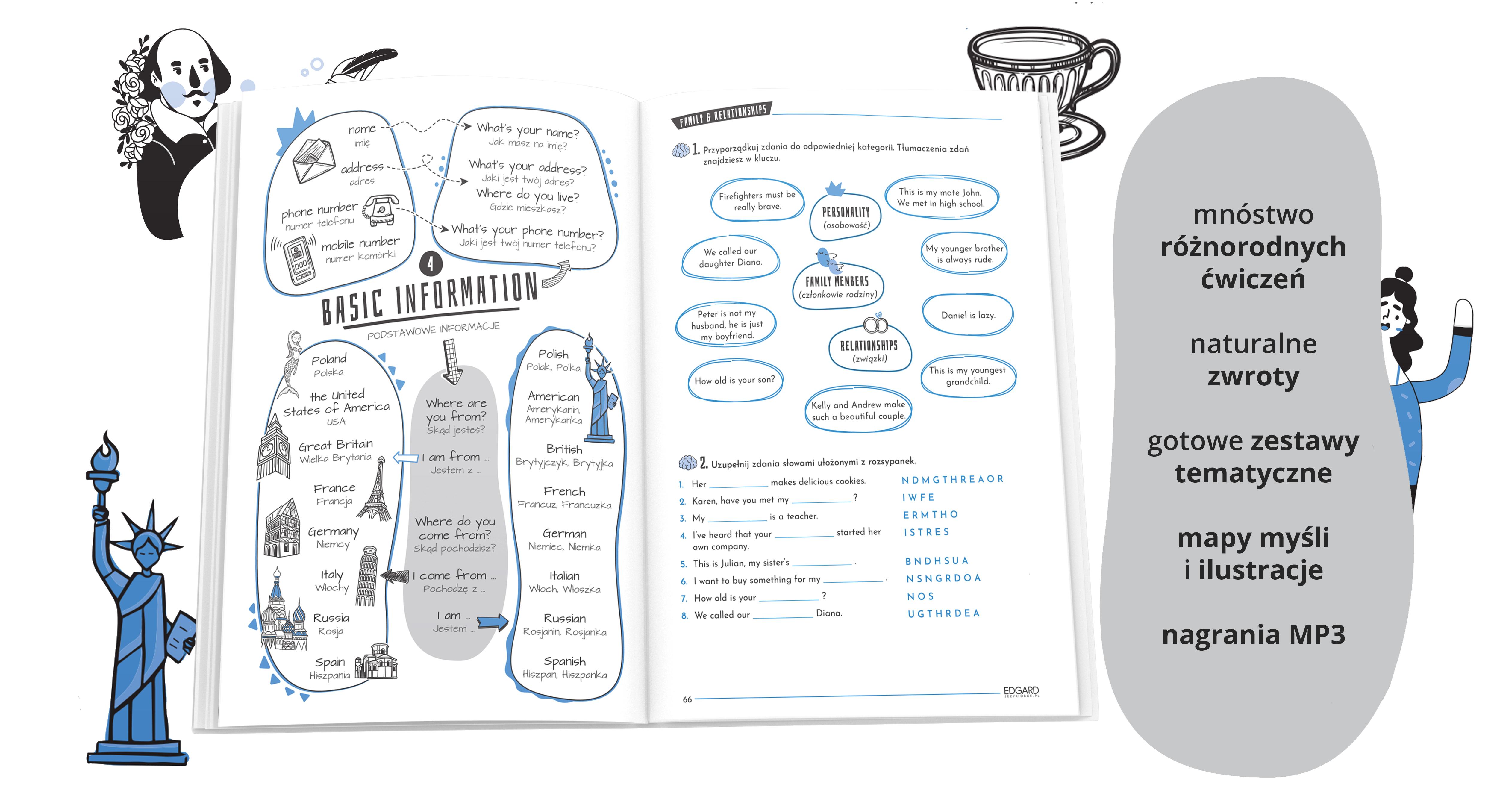 • mnóstwo różnorodnych ćwiczeń, dzięki którym poznajesz nie tylko słowa, ale również całe wyrażenia i struktury gramatyczne na poziomie A1