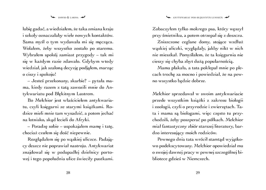 DAWID I LARISA to nowa seria Martina Widmarka – autora bestsellerowej serii Biuro Detektywistyczne Lassego i Mai. Tym razem książki przeznaczone są dla nieco starszych czytelników, a zatem wszystkich tych, którzy nauczyli się czytać, poznając kolejne przygody Lassego i Mai, i chcą przejść na kolejny poziom czytelniczych wyzwań i doznań. DAWID I LARISA to świetnie skonstruowane, trzymające w napięciu historie, w których wątek detektywistyczno-przygodowy prowokuje do refleksji nad współczesnym światem i mechanizmami jego funkcjonowania. Bohaterowie, uwikłani w skomplikowane intrygi, zmuszeni są do postawienia sobie pytań dotyczących ludzkiej egzystencji. Ciekawe tło przygód nastolatków Dawida i Larisy stanowi problematyka popularnonaukowa, np. eksperymenty genetyczne czy ekologia. Tom 1: ANTYKWARIAT POD BŁĘKITNYM LUSTREM Trzynastoletni Dawid pod nieobecność rodziców zamieszkuje u ich znajomego, Melchiora Rasmusena, właściciela Antykwariatu pod Błękitnym Lustrem w podupadłej dzielnicy portowej. Pewnego ranka Melchior znika. Pozostawiona przez niego krótka wiadomość pozwala Dawidowi i jego nowej koleżance Larisie podjąć poszukiwania. Stopniowo zaczynają oni odkrywać dziwne okoliczności zaginięcia Melchiora. Wkrótce będą się musieli zmierzyć z niełatwymi pytaniami na temat ludzkiego życia.Szczegółowe informacje na temat książki Antykwariat pod Błękitnym Lustrem