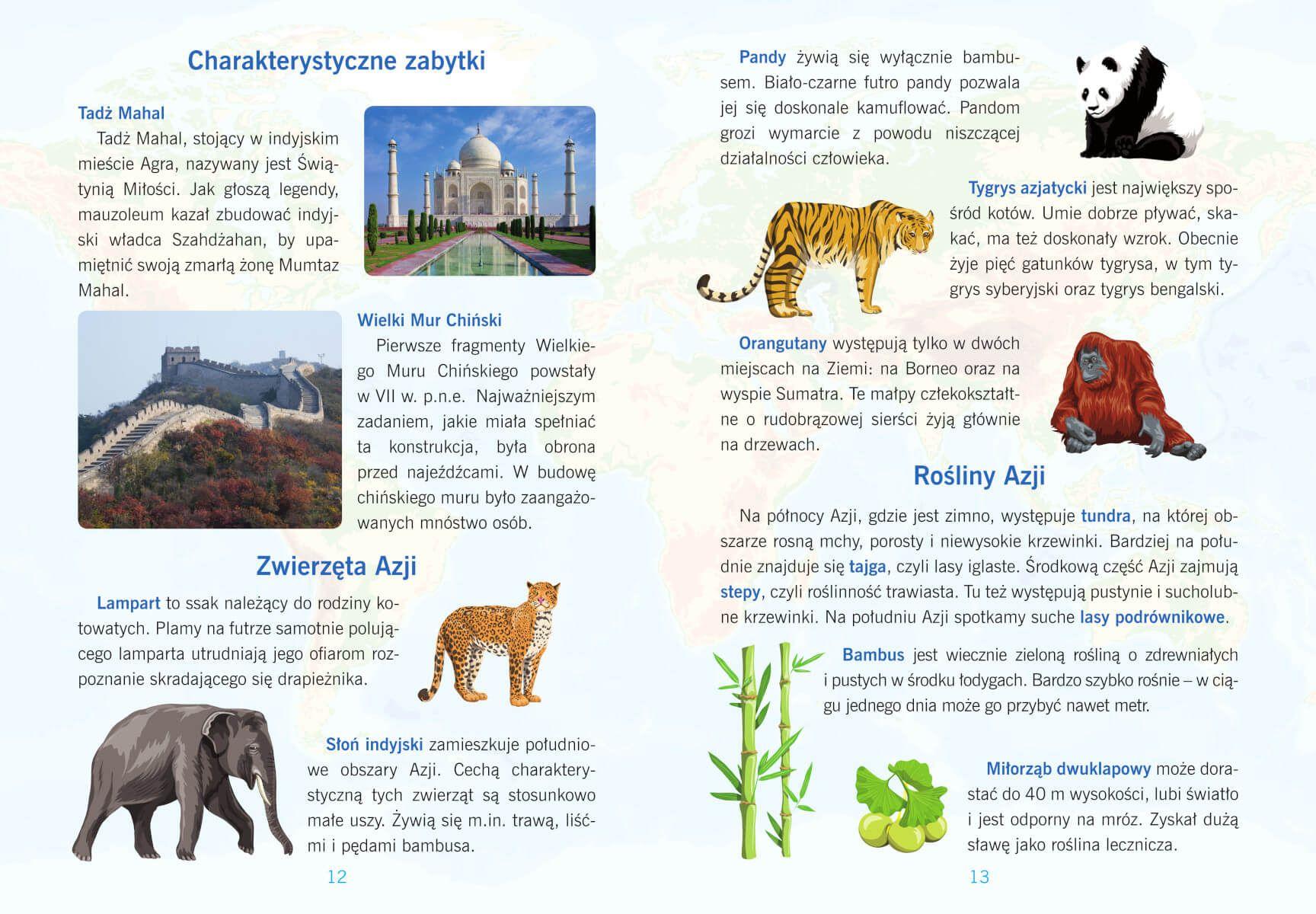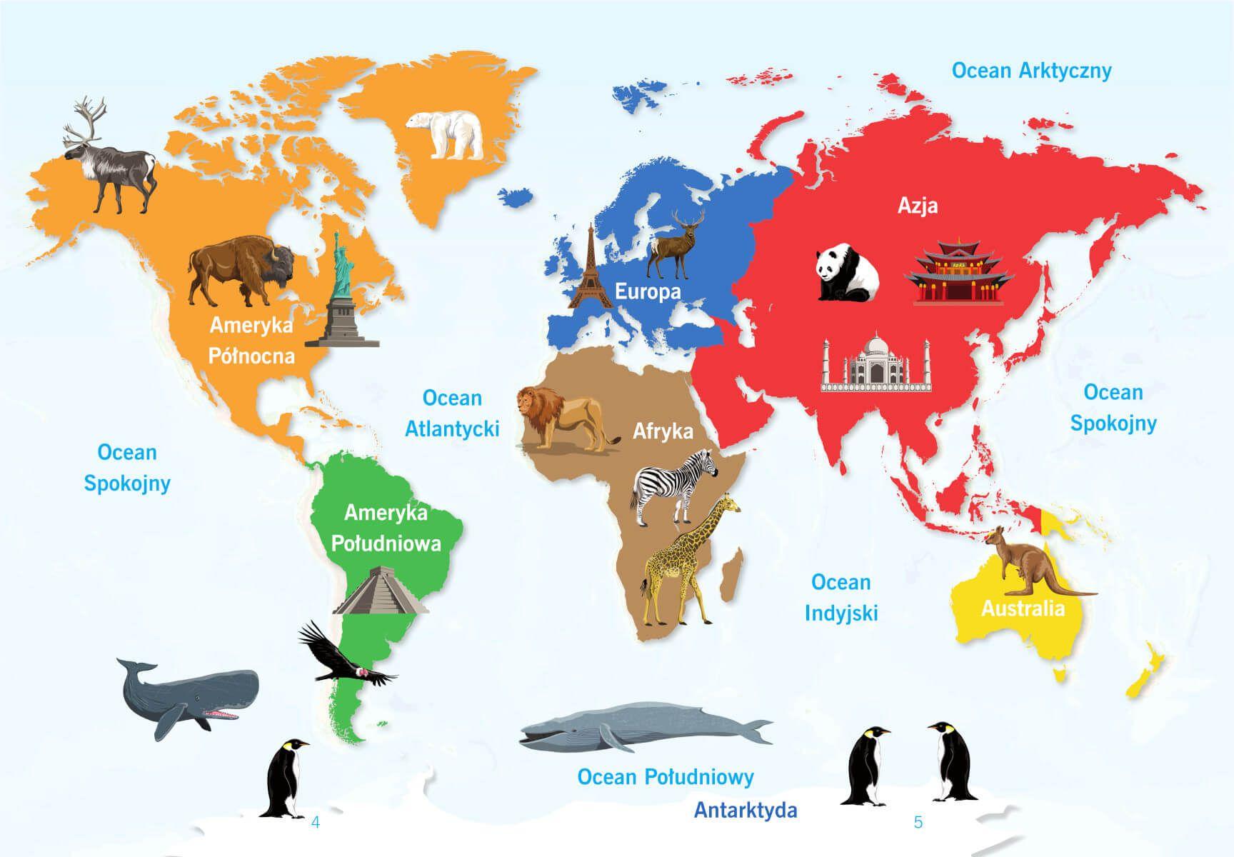 "Atlas świata dla dzieci" to książka, w której znajdziesz mnóstwo informacji o kontynentach. Poznasz państwa, niezwykłe miejsca, zabytki, a także rośliny i zwierzęta Europy, Azji, Afryki, Ameryki Północnej, Ameryki Południowej, Australii i Oceanii oraz Antarktydy. Przejrzyste mapy, ilustracje i zdjęcia pomogą ci w zdobywaniu wiedzy o wszystkich kontynentach.