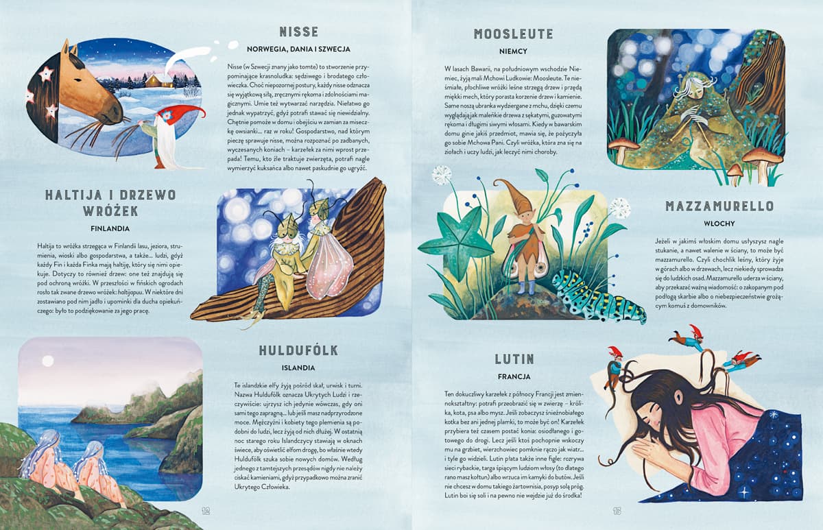 Nasi przodkowie od zawsze snuli opowieści o magicznym ludzie: o wróżkach, krasnoludkach, duszkach czy chochlikach. Czarodziejskie istoty są jednak płochliwe i wolą pozostawać w ukryciu. Dzięki tej książce poznasz je dużo lepiej: te, które mieszkają w dziuplach, kopalniach, ludzkich domach, morskich falach... a nawet w mrowiskach. Niełatwo wypatrzyć wróżkę, która sobie tego nie życzy. Trzeba zaglądać do kielichów kwiatów, w szczeliny skalne i pod czerwone kapelusze muchomorów. Wróżki są zmiennokształtne: często się przemieniają w konie, ptaki czy białe koty. A większość z nich prowadzi bezcielesne życie w równoległej rzeczywistości - zupełnie dla nas niewidoczna! Dostrzeżesz je, jeśli masz szczególny dar... albo dzięki szczęśliwemu zrządzeniu losu. Na przykład kątem oka podczas księżycowej nocy.