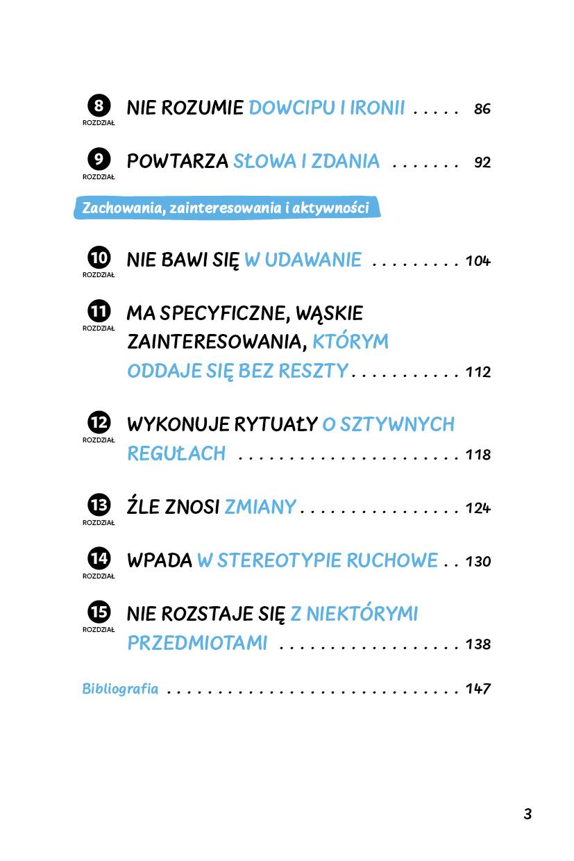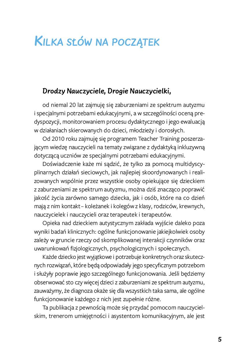 Potrzebujesz skutecznych strategii, jak postępować z dzieckiem z AUTYZMEM w szkole? W tej książce znajdziesz praktyczne porady i sugestie, przedstawione na przykładzie 15 sytuacji wynikających z typowych trudności towarzyszących zaburzeniom ze spektrum autyzmu. Zadbaj o przejrzyste polecenia. Dowiedz się, jak przekazywać informacje, żeby dziecko nie miało trudności z ich zrozumieniem Graj zespołowo. Do wychowania dziecka potrzebna jest cała wioska! Współpraca z innymi nauczycielami i pracownikami szkoły usprawni proces edukacyjny Nie zmuszaj. Uwzględnij indywidualne potrzeby dziecka i jego trudności sensoryczne, a praca w klasie będzie skuteczniejsza i przyjemniejsza. Zawsze pamiętaj, że dziecko z autyzmem może wykazywać zachowania problemowe, ale NIE JEST dzieckiem problemowym.
