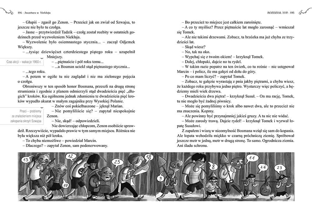 Podobno w starym ogrodzie w Niekłaju zakopane zostały skrzynie pełne skarbów! Koniecznie trzeba dowiedzieć się od Bosmana, gdzie dokładnie się znajdują! Poszukiwania ukrytego złota trwają i z pewnością mogą poróżnić wielu... Jednak okazuje się, że jest coś ważniejszego od tych sporów - niebezpieczni osobnicy planują wysadzić w powietrze fabrykę! Gdy trzeba uniemożliwić zamach i złapać złodziei cennego wynalazku, konflikty idą w niepamięć, a Piraci, Koloniści i Jaszczurki przestają walczyć o Ogród i działają ramię w ramię. Efekty ich wysiłków są doprawdy zaskakujące, także dla nich samych! Kto wie, może nawet uda się bitwa pod Grunwaldem...? Przedstawiamy lekturowe wydanie jednej z najbardziej znanych powieści Edmunda Niziurskiego - znanego i kochanego od pokoleń pisarza młodzieżowego! Starannie przygotowane i dopracowane pod względem merytorycznym opracowanie ułatwi pracę na lekcjach języka polskiego, a piękne czarno-białe ilustracje dodatkowo uprzyjemnią lekturę. Twarda oprawa sprawia, że książka jest trwała i efektownie się prezentuje, może więc z powodzeniem być prezentem lub nagrodą szkolną. Od 2014 roku Wydawnictwo GREG jest wyłącznym wydawcą książek Edmunda Niziurskiego przez okres pięciu lat.