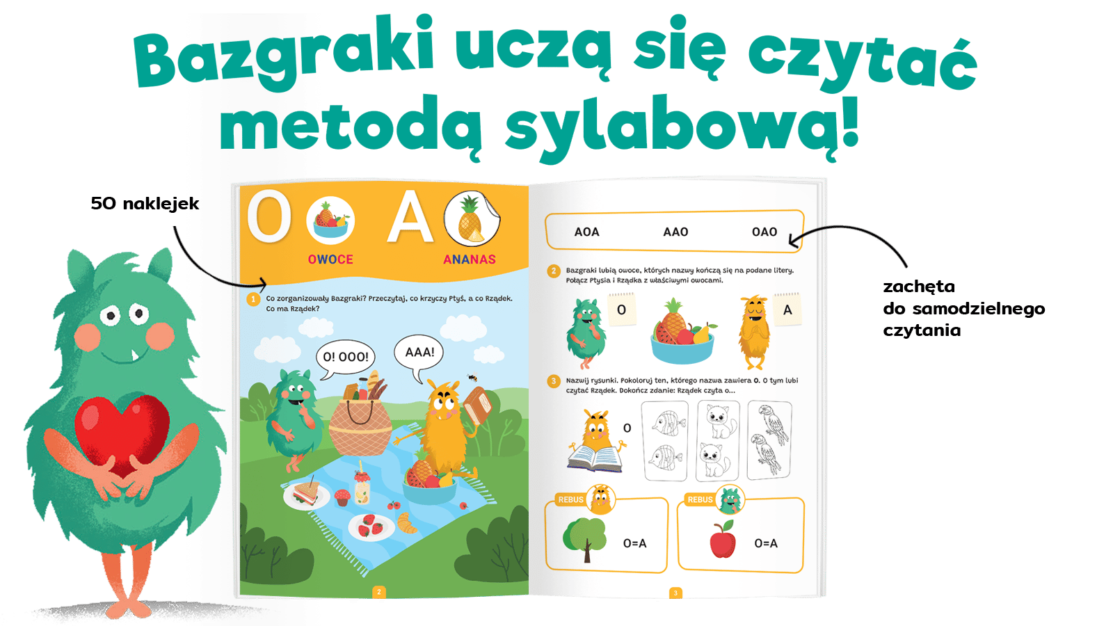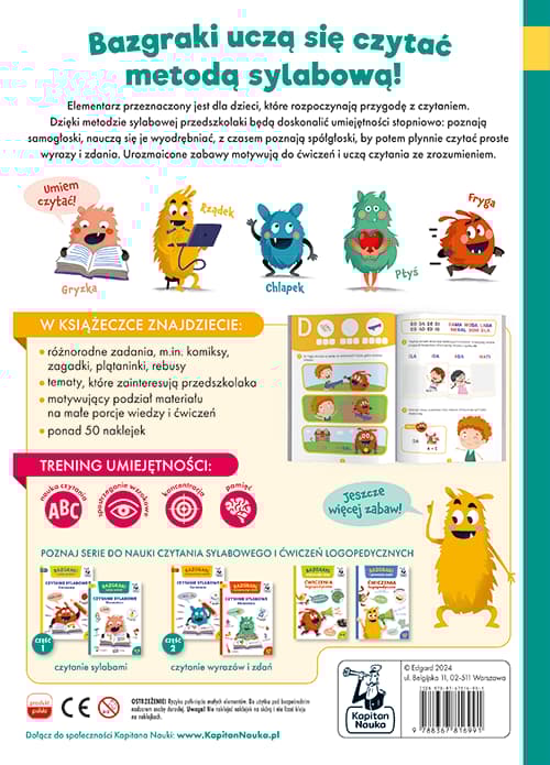 Bazgraki czytają sylabami. Czytanie sylabowe. Elementarz to bogato ilustrowana książka z ćwiczeniami dla dzieci, które rozpoczynają przygodę z czytaniem. Dzięki metodzie sylabowej przedszkolaki szybko uczą się odczytywać proste wyrazy, co znacznie przyspiesza naukę i motywuje do samodzielnego czytania.