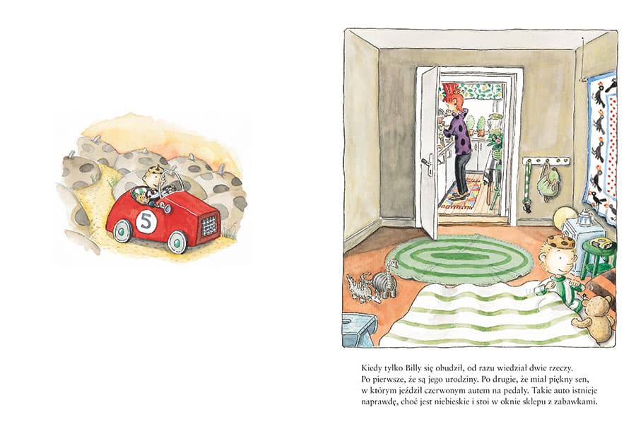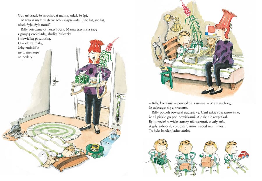 "Billy’emu śni się, że jeździ czerwonym autem na pedały, podobnym do tego, jakie widział w sklepie z zabawkami. Kiedy się budzi, przypomina sobie, że to jego urodziny. Może dostanie dziś w prezencie wymarzony samochód? Niestety paczuszka od mamy jest zdecydowanie za mała, a wszyscy inni najwyraźniej zapomnieli o jego urodzinach… Czy jednak aby na pewno? Wydawnictwo Zakamarki wznawia serię o Billym publikowaną niegdyś przez inną oficynę. Niezwykle zabawne i świetnie zilustrowane historie z życia tego kilkuletniego chłopca zyskały sympatię czytelników, dlatego Billy powraca – wypatrujcie zarówno nowych, jak i starych tytułów!"