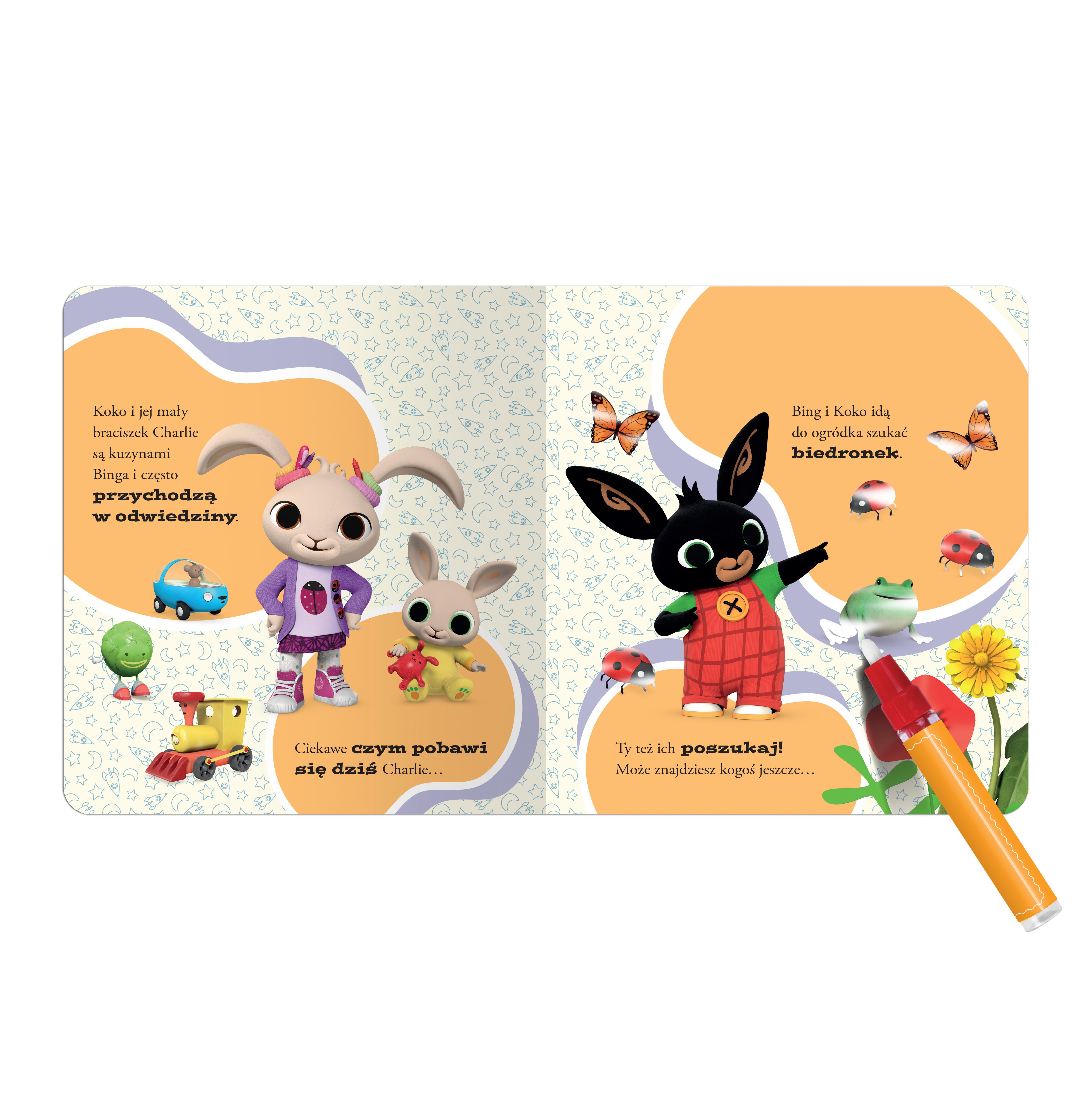 Bing przygotowuje koktajl, wybiera się na piknik z przyjaciółmi, bawi się klockami i wraz z Sulą spaceruje po parku. Ale… na wszystkich ilustracjach brakuje ważnych postaci lub elementów! Z jakich składników Bing przygotuje napój? Kto wraz z króliczkiem buduje wieżę z klocków? Co Sula i Bing zbierają podczas przechadzki w parku i jakie zwierzątko im w tym towarzyszy? Aby zobaczyć to wszystko, wystarczy zamalować białe pola na każdej stronie tej książki zwykłą wodą. A gdy papier wyschnie, ilustracje znów staną się niewidoczne i zabawę można zacząć od początku. Malowanie ułatwi dołączony do książki flamaster, który można bez końca napełniać wodą! Wodne czary-mary to bezpieczna kartonowa książka z zaokrąglonymi rogami. Jest odporna na najróżniejsze dziecięce ekspetymenty, a poręczny format pozwoli zabrać ją ze sobą do przedszkola, w odwiedziny do babci albo na spacer po parku. Kolorowanie czystą wodą nie pozostawia po sobie bałaganu jak malowanie farbami, papier nie przemięka, a tusz użyty w książce nie rozpuszcza się i nie plami. Jeśli więc podczas zabawy woda się wyleje, wystarczy ją po prostu wytrzeć, a otoczenie, ubranko, rączki małego artysty albo nowa biała kanapa pozostaną nietknięte! Książeczkę można kolorować w nieskończoność, dlatego z powodzeniem zastąpi kilka innych, klasycznych kolorowanek!