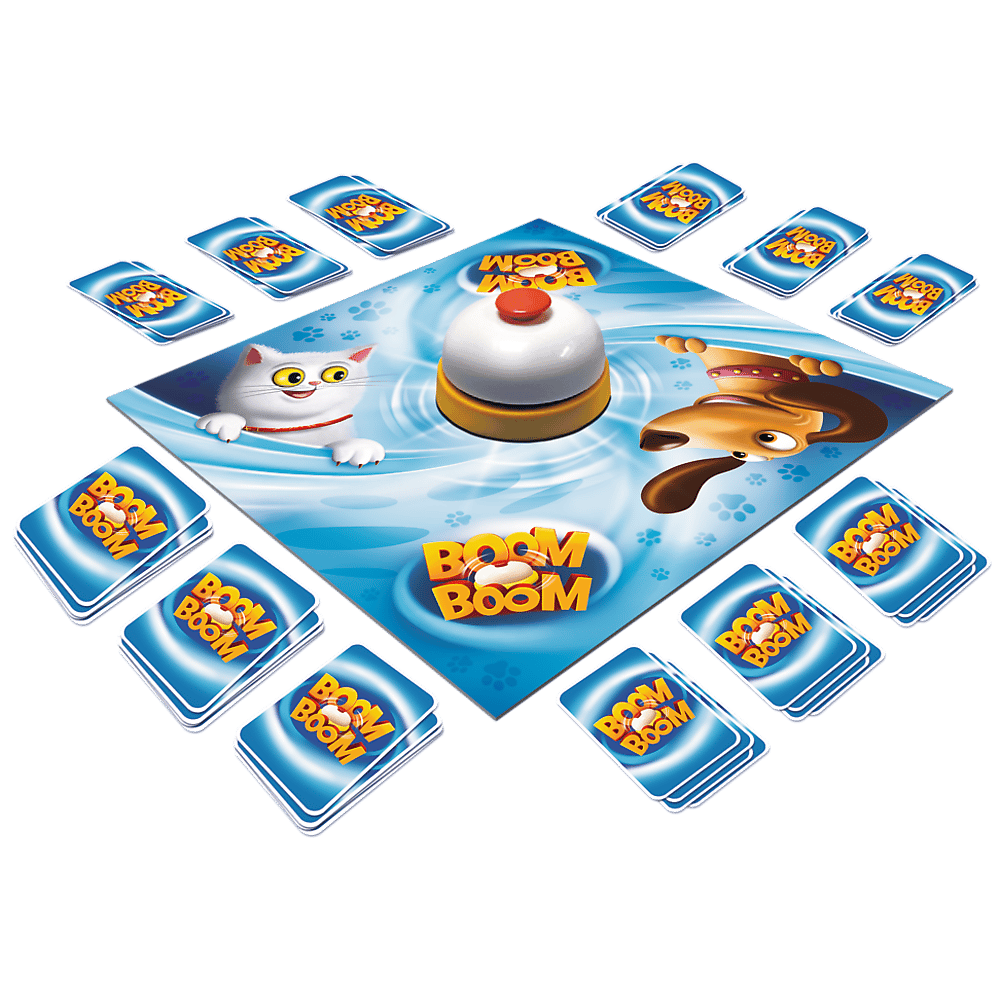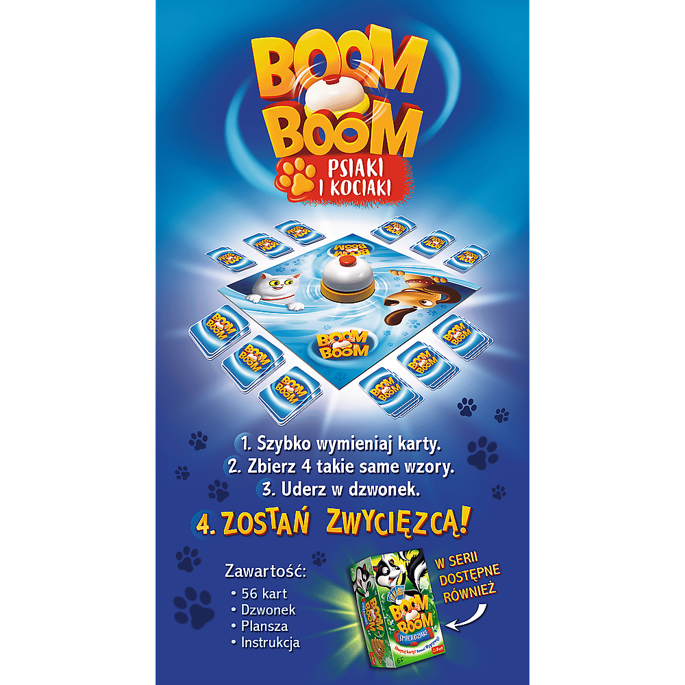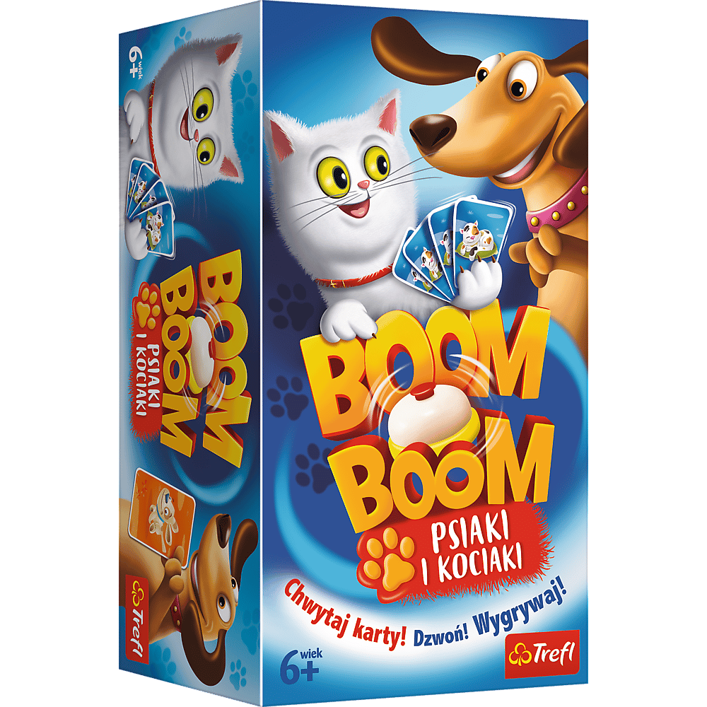 Boom Boom – Psiaki i Kociaki, to dynamiczna gra rodzinna, w której liczy się zręczność, spostrzegawczość i dobry refleks. W Boom Boom gracze starają się zebrać zestawy tych samych Psiaków i Kociaków. Wszyscy jednocześnie wymieniają karty z ręki z kartami na planszy. Po zebraniu zestawu gracz uderza w dzwonek, sygnalizując wykonanie zadania. Wydaje się proste, lecz gracze mogą polować na takie same karty. Gracz, który jako pierwszy zbierze odpowiednią liczbę zestawów Psiaków i Kociaków, zostaje zwycięzcą! Wiek graczy: 6+ Liczba graczy: 2-4 Czas rozgrywki: 10-20 minut