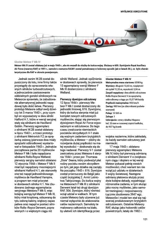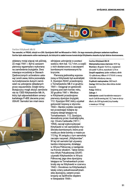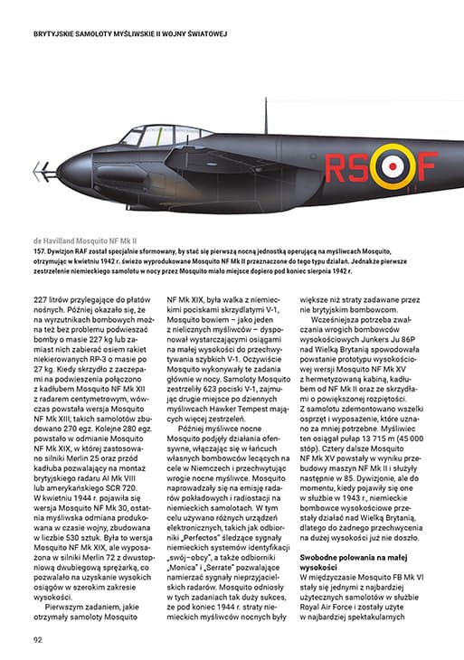 Książka Edwarda Warda stanowi doskonały przewodnik po typach jednosilnikowych i dwusilnikowych myśliwców, morskich myśliwców pokładowych oraz samolotów myśliwskich o napędzie odrzutowym, jakimi dysponował Królewskie Siły Powietrzne (RAF) oraz lotnictwo Australii (RAAF), Kanady (RCAF) i Nowej Zelandii (RNZAF) w latach 1939-1945. Ten Leksykon zawiera opisy wielu typów, od ikonicznego Hawker Hurricane, stanowiącego podstawowe wyposażenie brytyjskiego lotnictwa myśliwskiego w czasie bitwy o Anglię, poprzez bardzo uniwersalnego Bristola Beaufightera, używanego jako nocny myśliwiec, ale również do atakowania celów nawodnych, aż po myśliwskiego i myśliwsko-bombowego Hawkera Tempesta o mocnej konstrukcji, najszybszego śmigłowego samolotu II wojny światowej. Opisano też zbudowane w Stanach Zjednoczonych samoloty używane w lotnictwie brytyjskim i państw Wspólnoty Brytyjskiej, w tym Bell Airacobra, Curtiss Kittyhawk, Vought F4U Corsair i North American P-51 Mustang.