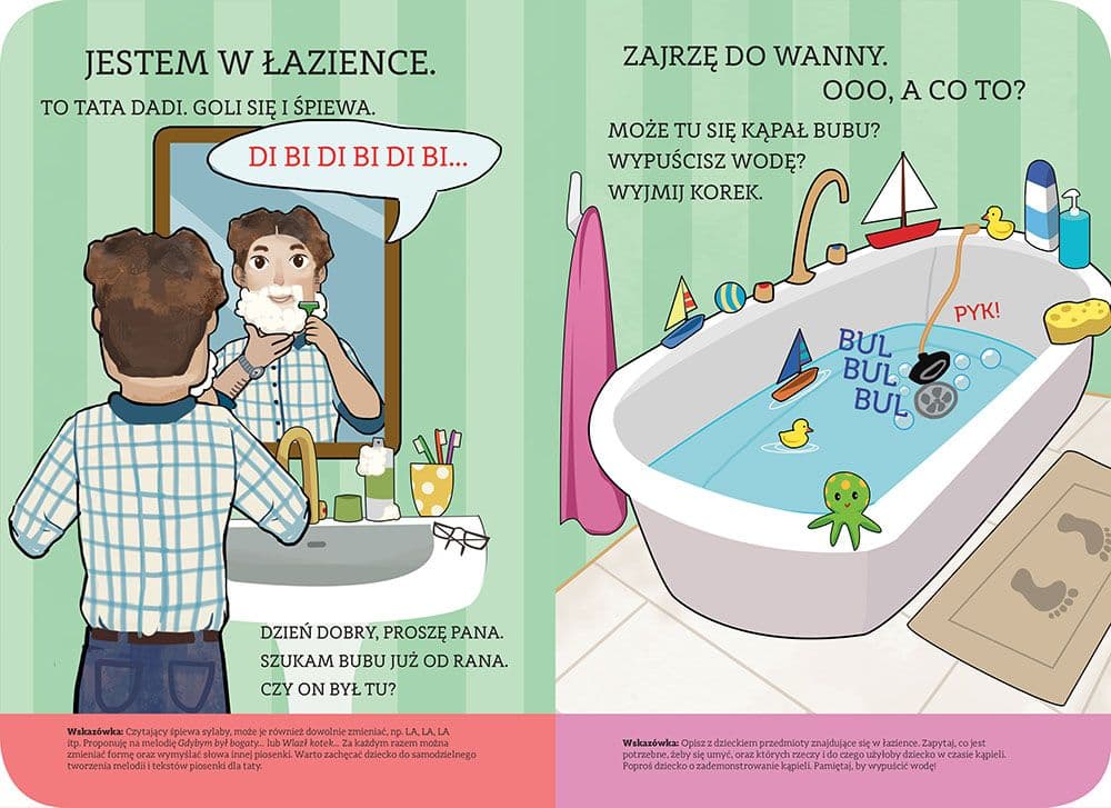 Bubu już mówi. Szukaj mnie! to niepowtarzalna propozycja dla rodziców dzieci w wieku od 2 do 5 lat, które rozwijają umiejętność sprawnego posługiwania się mową. Książeczka jest interaktywna, czyli przeznaczona do wspólnej zabawy z dzieckiem, przygotowana w ten sposób, by wywoływać aktywność malucha i skłaniać go do czynnego udziału w lekturze. Stymuluje nie tylko mowę, ale też pamięć, koncentrację, percepcję wzrokową i motorykę, które są niezbędne dla prawidłowego rozwoju dziecka.Bubu to sympatyczny chłopczyk, znany już z pierwszej książeczki o jego przygodach - Bubu uczy się mówić. A kuku! Tym razem możecie wybrać się z wizytą do domu Bubu. Dziecko może zwiedzić wszystkie pomieszczenia, poznać bliżej członków rodziny Bubu i zobaczyć, jakimi ciekawymi sprawami się zajmują. Ale... gdzie jest Bubu? Poszukajcie go razem i sprawdźcie, gdzie się schował!Gwarantujemy doskonałą zabawę!Szczegółowe informacje na temat książki Bubu już mówi. Szukaj mnie!