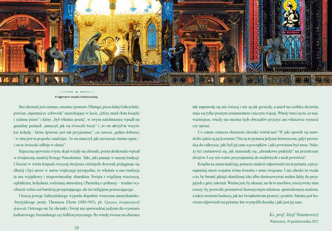 Wielka i pompatyczna na placu Rockefellera w Nowym Jorku, skromniejsza z aniołkami i gwiazdami na polskich świerkach czy egzotyczna i zaskakująca w formie cisów czy drzewek pomarańczowych w Ameryce Południowej. Choinka jest uniwersalnym znakiem Świąt Bożego Narodzenia, znanym, ogromnie lubianym i stosowanym na całym świecie. Jak to się jednak stało, że zwykłe zielone drzewko stało się symbolem Narodzin Jezusa? Na to pytanie w tej jakże frapującej książce odpowiada ks. prof. Józef Naumowicz, światowej klasy ekspert od historii, tradycji i teologii Bożego Narodzenia. Wędrujemy razem z nim po kartach Pisma Świętego poznając rodowód Jezusa oraz świadectwo Jego narodzin w Betlejem. Idziemy też dalej, z bohaterami pierwszych stuleci chrześcijaństwa, aż do średniowiecza, kiedy ozdoby roślinne, wieńce i wreszcie drzewka stają się symbolem tego, co ludzkości przyniósł Chrystus – życia wiecznego. Wreszcie choinka dociera także do Polski i szybko zostaje uznana u nas za zwyczaj odwiecznie polski, choć były przecież wcześniej u nas także tzw. sady u sufitu czy podłaźniki na Podhalu. Autor tej niezwykle ciekawej i przepięknie ilustrowanej – m.in. fotografiami Adama Bujaka – książki tłumaczy, dlaczego kiedyś na choinkach wisiały głównie jabłka i opłatki, a dzisiaj dominują bombki czy światełka. Wspólnie z ks. Naumowiczem odwiedzamy świąteczne domy w Londynie, Pradze, Rzymie, Krakowie czy Paryżu i dowiadujemy się, że to dzięki pewnej Polce pierwsza choinka zawitała do stolicy Francji. Autor weryfikuje i obnaża wiele mitów, odnośnie do jakoby pogańskich źródeł niektórych bożonarodzeniowych zwyczajów, a także i ten, że to rzekomo Luter jest wynalazcą choinki. Te opinie bywają do dzisiaj powtarzane, warto więc odkryć z autorem książki prawdę i dotrzeć do głębokiej symboliki bożonarodzeniowego drzewka. W książce tej poznajemy poprzedników choinki oraz piękne opisy ozdabianego na wiele sposobów „drzewa życia”, dokonane piórami pisarzy i poetów, a także papieży – św. Jana Pawła II i Benedykta XVI.
