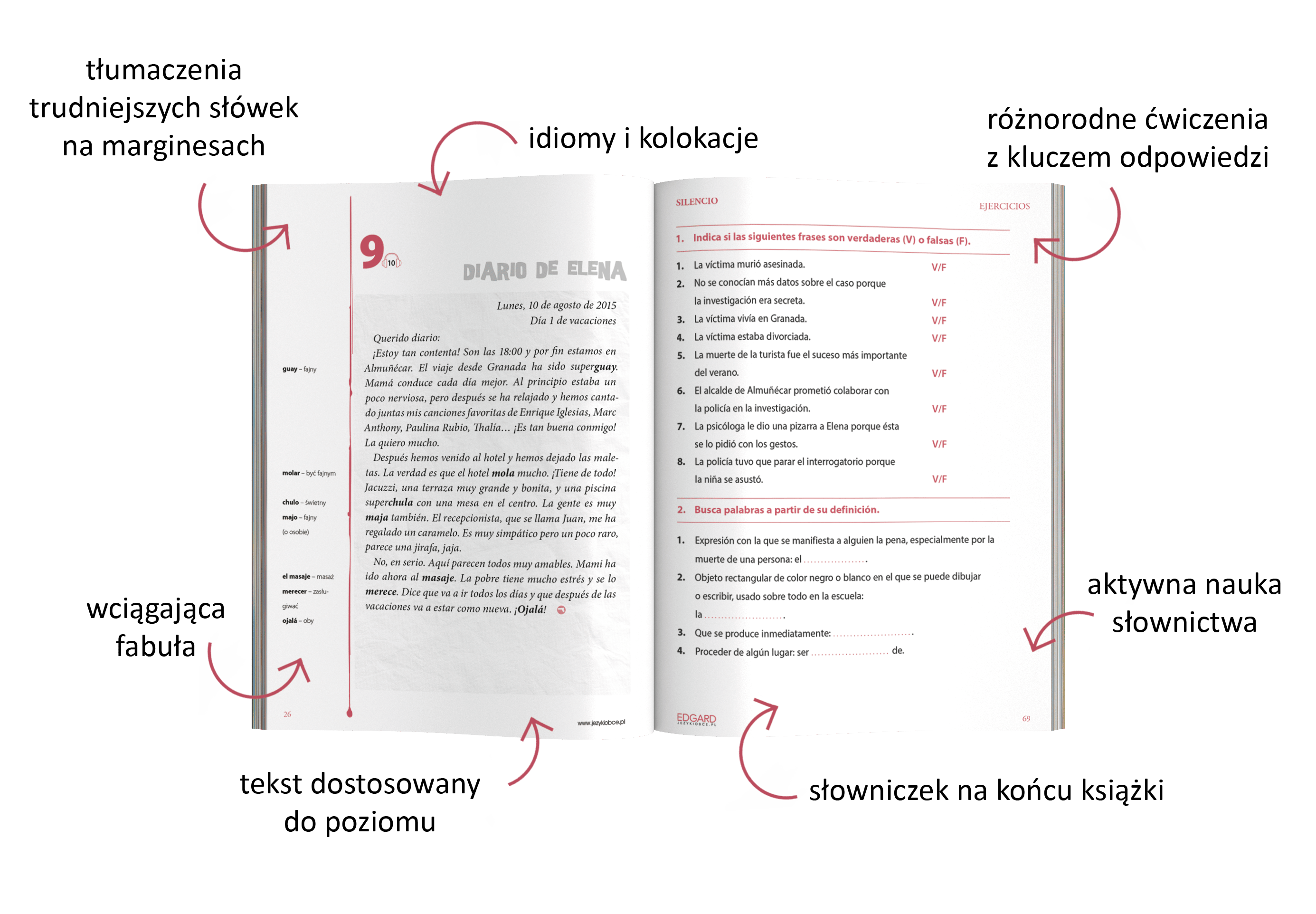 Tłumaczenia trudniejszych słówek na marginesach ułatwiają czytanie i zrozumienie fabuły bez konieczności odrywania się od lektury. Liczne ćwiczenia na rozumienie tekstu oraz na utrwalenie poznanego słownictwa i struktur pomagają w lekki i naturalny sposób przyswoić hiszpański na poziomie B1–B2, by używać go swobodnie także w codziennym życiu.