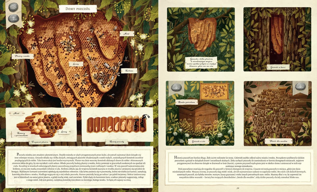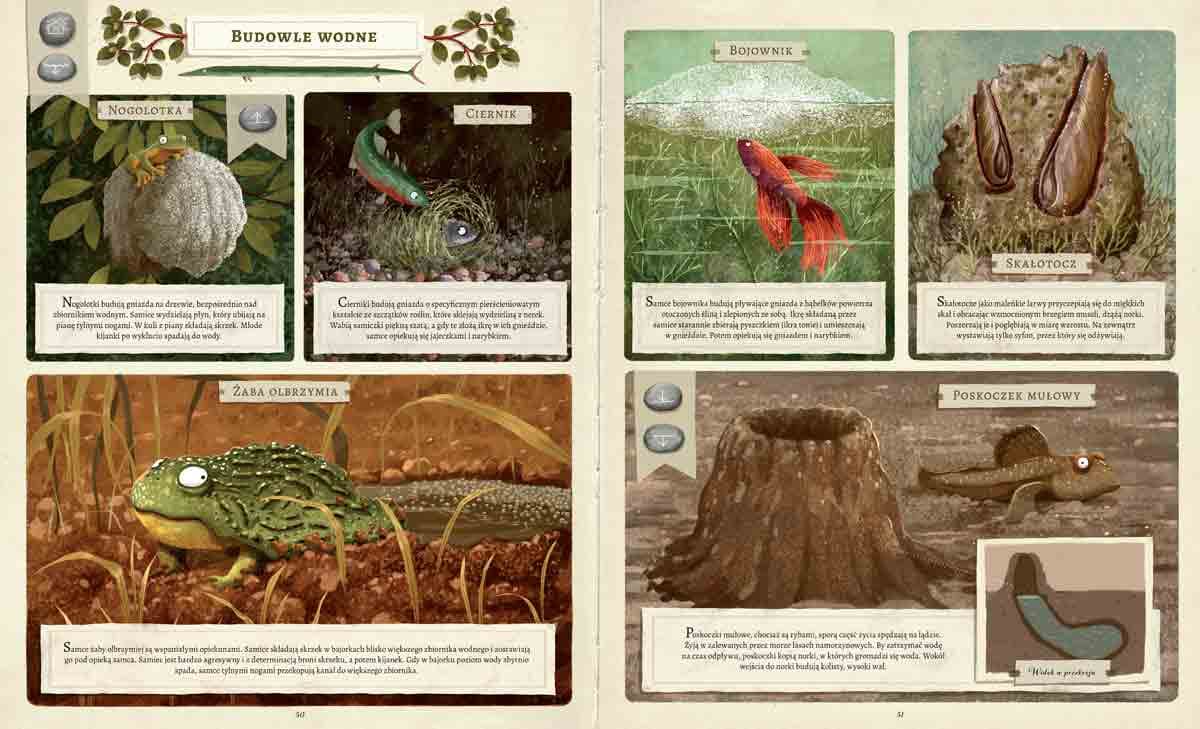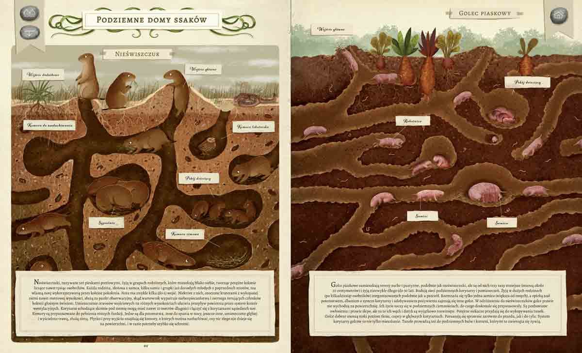 Zwierzęta to prawdziwi mistrzowie architektury! Emilia Dziubak w swym niezwykłym atlasie przedstawia ich najciekawsze dokonania: budowle naziemne i podziemne, domy na wodzie i pod wodą, domy jednorodzinne i kawalerki, osiedla, domy przenośne i tymczasowe. Wśród licznych przykładów znalazły się między innymi: gniazdo uszyte przez krawczyka, gniazda ze śliny, jedna z największych ptasich budowli, czyli kopiec lęgowy nogala zmiennego, spiżarnia dzięciura żołędziowego, ogromna konstrukcja tkaczy towarzyskich, altanka ogrodnika brunatnego, papierowe gniazdo osy pospolitej, gniazdo pszczół i innych owadów, kopce mrówek, ale również mosty i tratwy mrówek legionistek, termitiery, pułapki pająków, kawalerki larw chruścików, rozbudowane nory golców piaskowych, żeremia bobrów, krecie tunele i wiele innych.