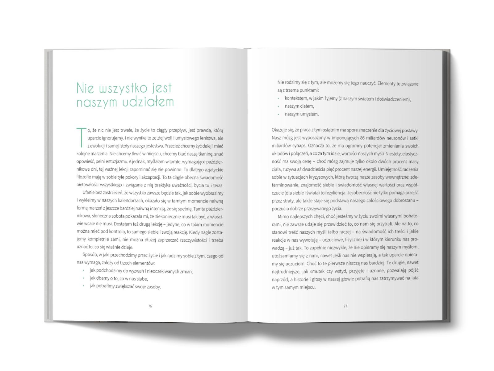 To nie jest książka, w której znajdziesz receptę na to, jak być spełnionym i ciągle szczęśliwym, a także jak szybko pozbyć się tęsknoty za tym, co już odeszło. Zamiast tego dowiesz się, jak przeżywać życie w pełni oraz szanować nieubłagalne zasady nim rządzące. Codziennie koncentrujemy się na tym, aby mieć coraz więcej, a nasze wszelkie niepowodzenia oznaczają, że jesteśmy przegrani, niewystarczający, za mało się staramy. W rzeczywistości, w której trzeba ciągle być zadowolonym i odhaczać kolejne pozycje na liście „to do”,nie ma przestrzeni na przyznanie się do smutku czy bezradności. Tymczasem przez całe życie mierzymy się z poczuciem straty – bliskiej osoby, domu, miłości, bezpieczeństwa, pracy, możliwości. Agnieszka Krzyżanowska pokazuje na swoim przykładzie, jak po wydarzeniach, które czasami wydają się nam prywatnymi końcami świata, na nowo poznać i odnaleźć siebie – powoli, godzina po godzinie, dzień po dniu. Dla autorki trudne chwile to okazja do zatrzymania się, nauki uważności, aby zacząć dostrzegać to, co jest dla nas naprawdę istotne.