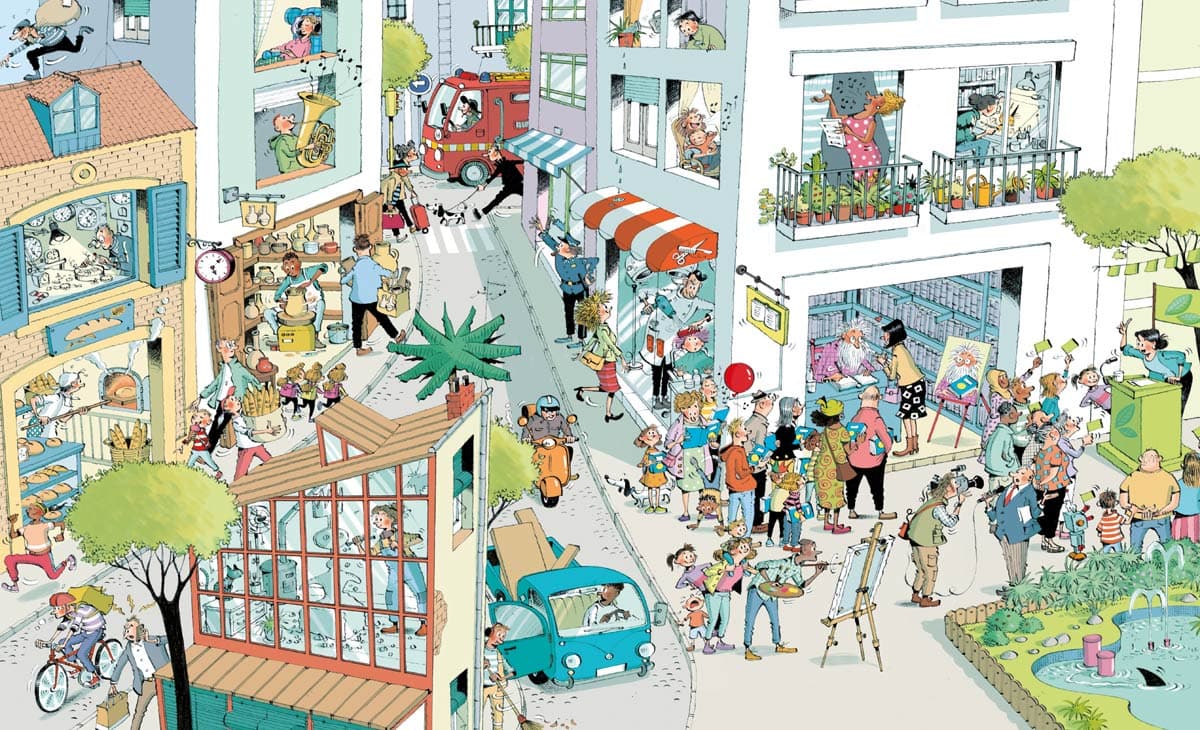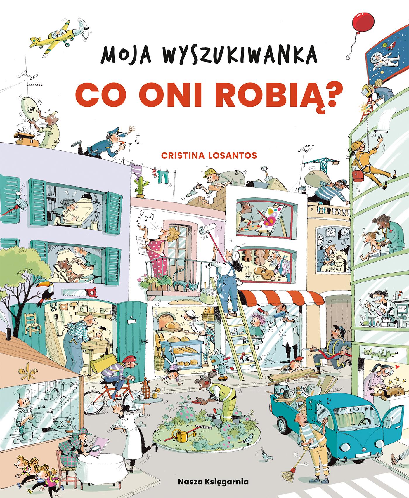 Na każdym kroku coś się dzieje: piekarz wyciąga z pieca chrupiące bochenki, malarz zmienia kolor ściany, policjant ma oko na złodziejaszka, a tajemnicza para w płaszczach znika w tłumie… Tętniące życiem miasteczko skrywa wiele niespodzianek.Przyjrzyj się uważnie każdej ilustracji. Szukaj postaci, zwierząt i nietypowych przedmiotów oraz rozwiązuj zagadki, dzięki którym dowiesz się, co przygotowują mieszkańcy miasteczka.Cristina Losantos – ilustratorka, absolwentka Wydziału Sztuk Pięknych Uniwersytetu w Barcelonie. Zawodowo zajmuje się ilustracją od 1985 roku. Obecnie współpracuje z wieloma wydawnictwami w Hiszpanii i innych krajach europejskich, a także regularnie ilustruje dla czasopism takich jak „Cavall Fort” i „El Tatano”. Powyższy opis pochodzi od wydawcy.Szczegółowe informacje na temat książki Co oni robią? Moja wyszukiwanka