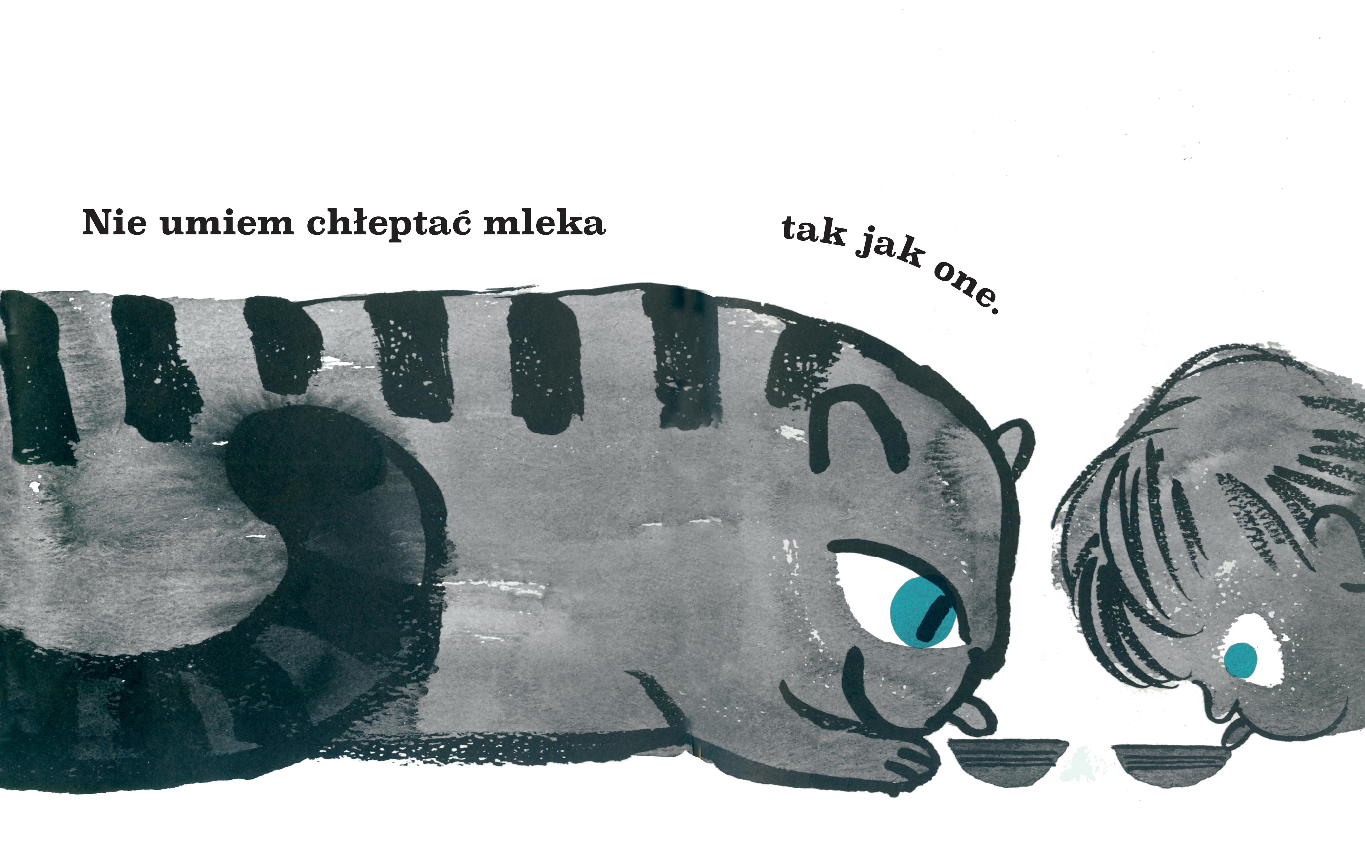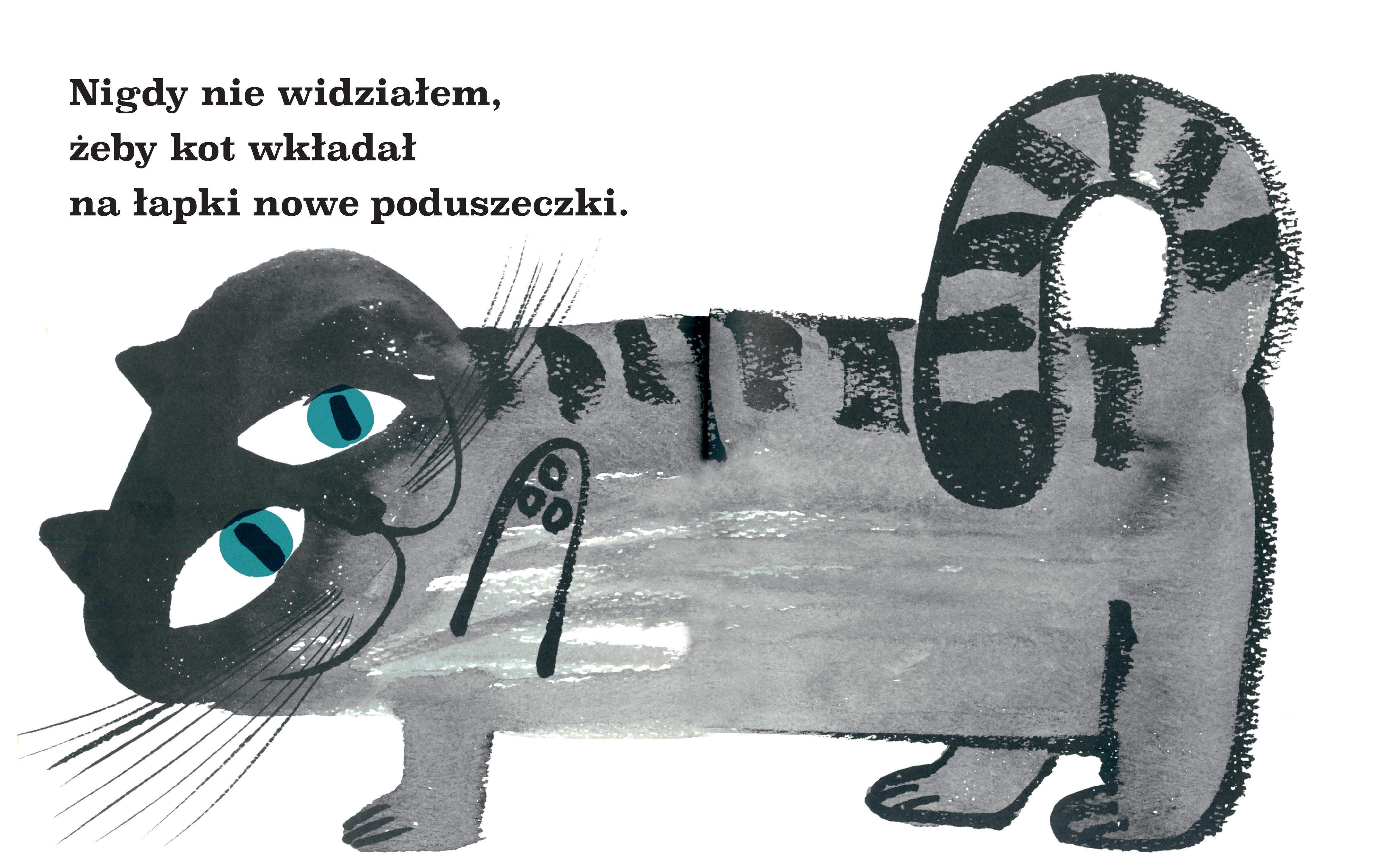 Jest wiele rzeczy, które koty – w przeciwieństwie do dzieci – potrafią zrobić. Na przykład: chłeptanie mleka albo używanie języka jako grzebienia. Jest też wiele rzeczy, których koty nie potrafią, chociażby: śpiewanie dzieciom kołysanek lub złażenie z drzew… W tej szalonej historyjce o tajemnicach kotów i ich sekretnym życiu, opowiedzianej z punktu widzenia małego dziecka, Abner Graboff łączy głos dziecięcej niewinności ze wspaniałym poczuciem humoru. Żartobliwe, zamaszyste ilustracje dopełniają prosty tekst, do którego inspiracją stał się kot-ulubieniec całej rodziny. Abner Graboff – autor licznych grafik i ilustracji do książek dla dzieci, tworzył w latach 1950-1970. W przygotowaniach do tej książki pomogli mu trzej synowie, którzy zajęli się obserwacją kota Tarzana.