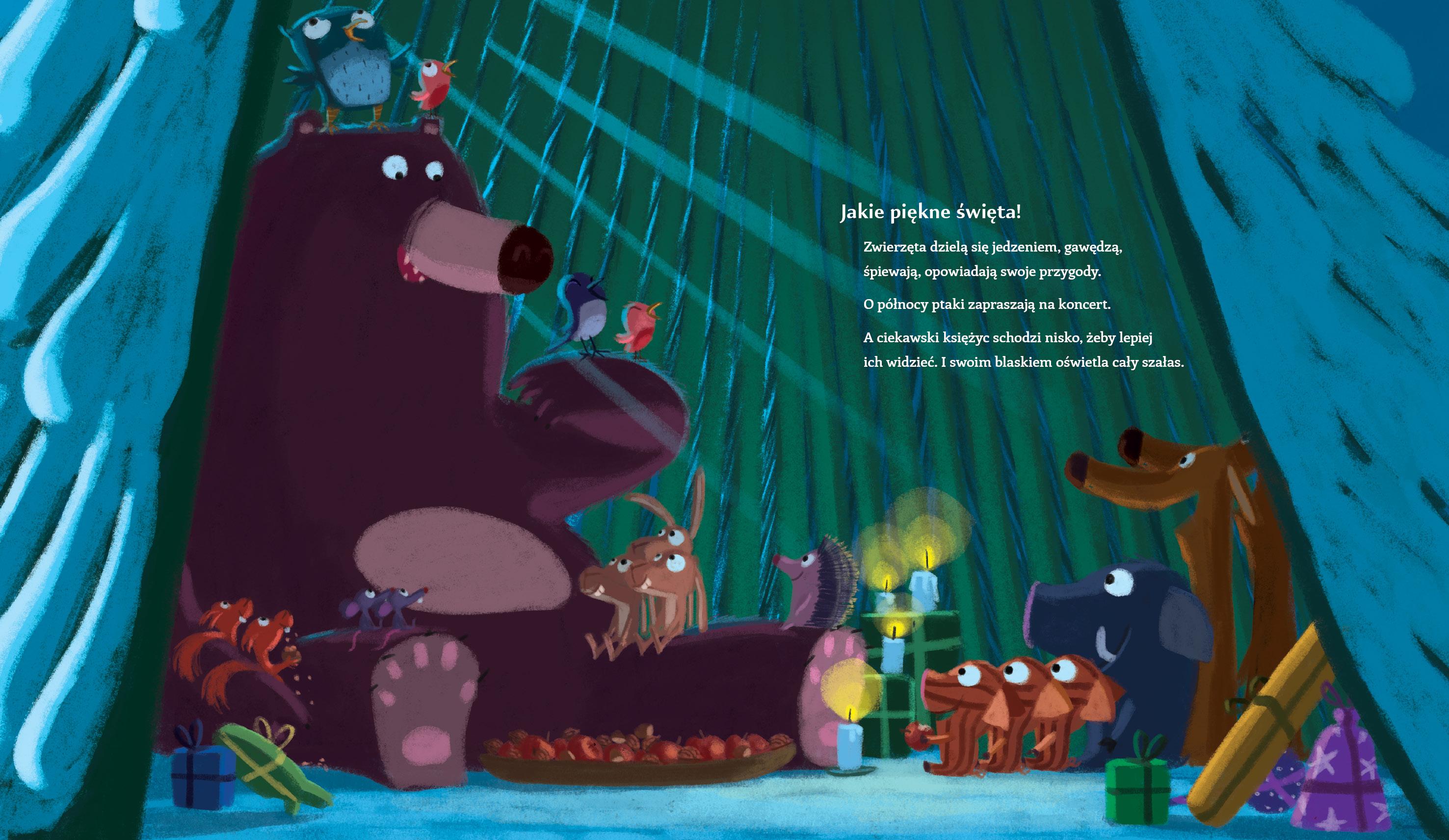 W Wigilię zwierzęta w lesie szykują się do radosnego świętowania. Niedźwiedź niesie choinkę do gawry, gdy nagle się przewraca – bardzo boli go łapa i nie może dalej iść. Leśni przyjaciele chcą przenieść niedźwiedzia do domu, ale nie dają rady… Wspólnymi siłami budują wokół misia szałas, świątecznie go ozdabiają, przynoszą smakołyki i razem spędzają Wigilię – pełną przyjaźni, dobroci i wsparcia. „Cudowna Wigilia niedźwiedzia” to urocza opowieść o tym, że w Święta najważniejsze są bliskość i wspólne chwile.Szczegółowe informacje na temat książki Cudowna Wigilia niedźwiedzia