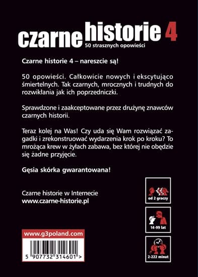 Czarne historie 4 znów dadzą wam szanse stanąć przed strasznymi opowieściami i sprawdzić jak wiele emocji jesteście w stanie wytrzymać podążając śladami mordercy. W tej grze nie ma przegranych, ani wygranych. Wszyscy bawią się wspólnie rozwiązując zagadki, które stawiają przed nimi karty wchodzące w skład zestawu. Nowe historie to zbiór najbardziej elektryzujących i intrygujących opowieści, które uczestnicy muszą dokładnie przebadać, aby zrekonstruować wydarzenia poszczególnych incydentów, kompletując je kawałek po kawałku. 50 opowieści. Całkowicie nowych i ekscytująco śmiertelnych. Tak czarnych, mrocznych i trudnych do rozwikłania jak ich poprzedniczki. Czarne historie 4 to kontynuacja bestsellerowego zestawu Czarne historie, który podbił serca miłośników zagadek kryminalnych nie tylko w Polsce, ale i na całym świecie. Zestaw tworzący Czarne historie 4 został zebrany i przygotowany przez Holgera Böscha, który także tym razem dopilnował, aby w pudełku z grą znalazły się same najlepsze historie, a wszystkie z nich dało się rozwiązać. Za tworzącą doskonały klimat oprawę graficzną i tym razem odpowiedzialny był Bernard Skopnik. Międzynarodowy bestseller! PUDEŁKO ZAWIERA: 50 kart instrukcja Liczba graczy: 2 - 15 Wiek graczy: od 14 lat Czas gry: 45 min.