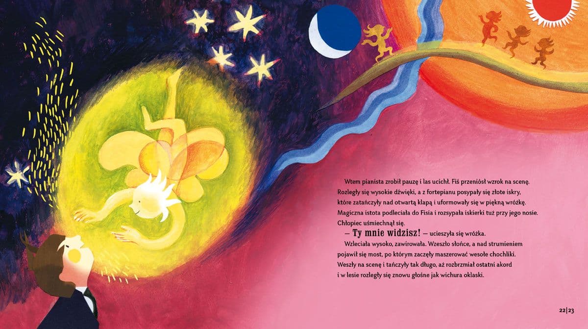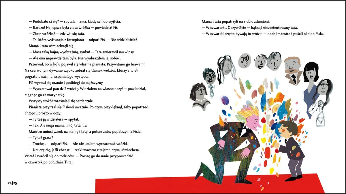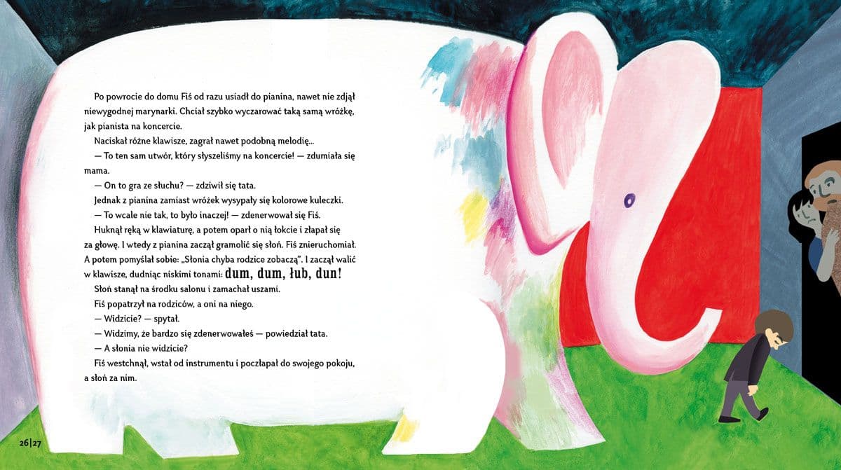 Pewnego dnia w salonie rodziny Fisia staje pianino i odtąd chłopiec może słuchać granej przez mamę muzyki i sam uczy się grać. Ku swojemu zdziwieniu, wydobywając dźwięki z czarodziejskiego – jak sądzi – instrumentu, widzi… kolory i kształty. Z czasem pojawiają się i kotek, i płotek, a po pokoju chodzą kurki trzy i hopsasają krasnoludki. A jeszcze piękniejsze obrazy powstają, kiedy do pianina siada mama… Koncert fortepianowy, na który rodzice zabierają Filemona, zmienia na zawsze jego życie. Okazuje się bowiem, że nie tylko on ma dar widzenia dźwięków i przywoływania muzyką niezwykłych obrazów. Choćby słoni albo wielkiego deszczu! Czy to czarodziejskie instrumenty czynią cuda, czy wyobraźnia i niezwykłe zdolności chłopca? Przeczytajcie opowieść o Fisiu i jego rodzicach, którzy chcieliby dorównać wyobraźnią utalentowanemu synkowi, i o mistrzu, który wychowa kolejnych wirtuozów, a ci – kolejnych, których połączył ten sam dar. Kto wie, może podczas czytania tej książki i Wam uda się dostrzec kolory słów? Albo usłyszeć dźwięki czarodziejskiego pianina… Z pewnością usłyszała je ilustratorka Marianna Oklejak, która tę niezwykłą opowieść Joanny Olejarczyk namalowała... muzyką.Szczegółowe informacje na temat książki Czarodziejskie pianino Fisia