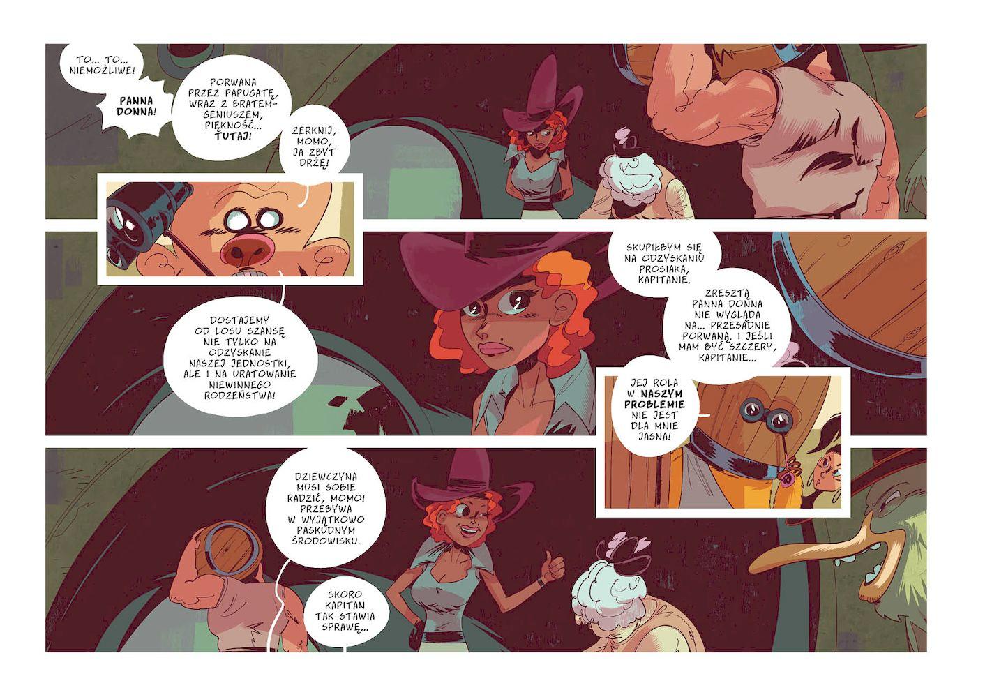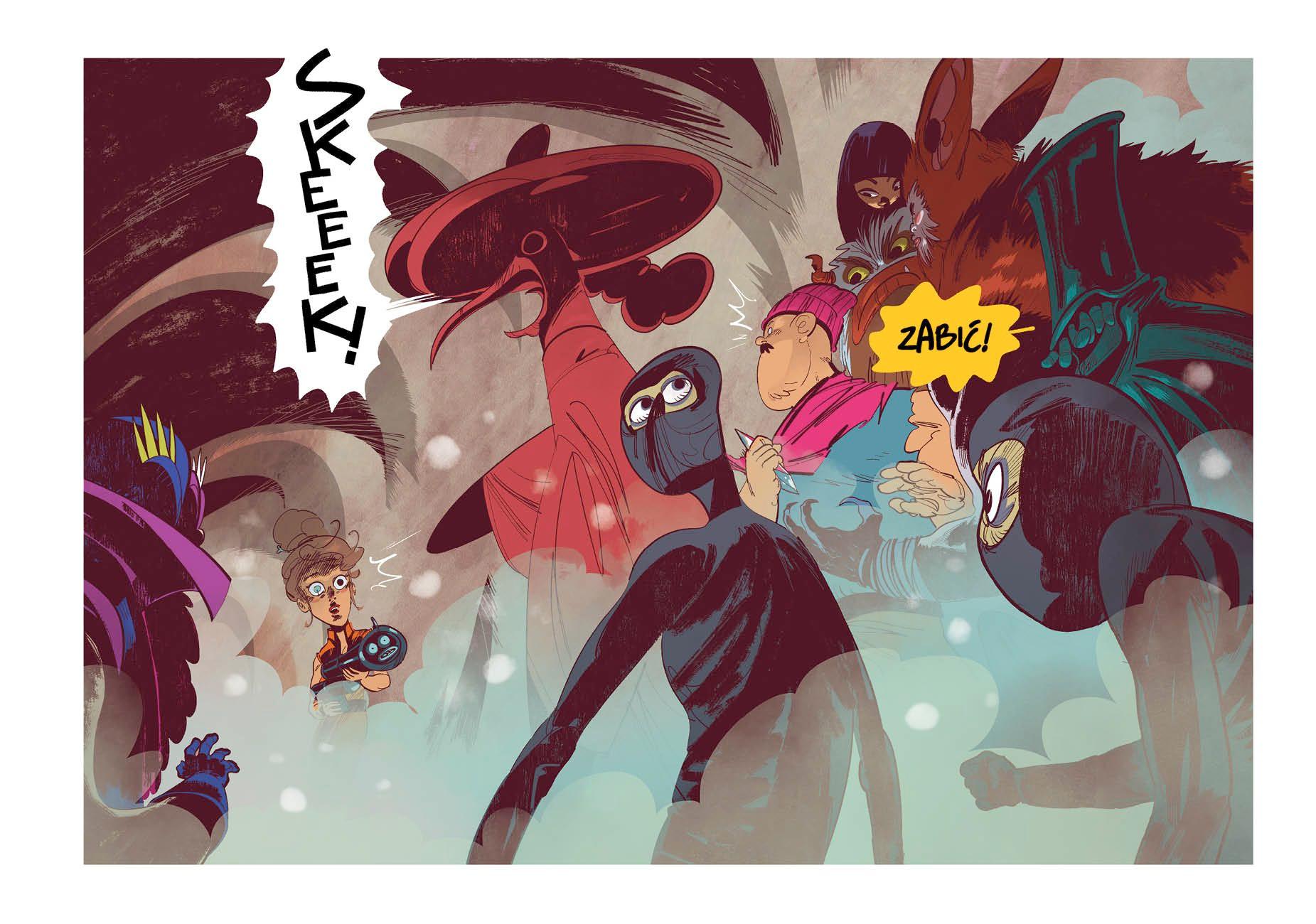 Najnowszy komiks Michała „Śledzia” Śledzińskiego, autora słynnego „Osiedla Swoboda”, czy „Na szybko spisane”. Kontynuacja szalonych przygód załogi statku kosmicznego Śpiący Prosiak, który to statek wciąż jest w posiadaniu Papugaty, międzygwiezdnego łotra i pirata. Nasi bohaterowie - Budo, Momo de Momos, Bebetto oraz Wiśnia – znów spróbują odzyskać swoją własność, a przy okazji może uda im się również ocalić System i wszystkie zamieszkujące go stworzenia. Choć to wcale nie jest powiedziane. Fantastycznie narysowany, pełen niesamowitych przygód, jednym słowem epicki „Czerwony Pingwin musi umrzeć” to list miłosny „Śledzia” do popkultury – animowanych filmów i seriali, gier wideo i oczywiście komiksów. W jego warstwie graficznej widać nawiązania zarówno do mangi, amerykańskich komiksowych zeszytów, jak i legendarnych albumów Tadeusza Baranowskiego.