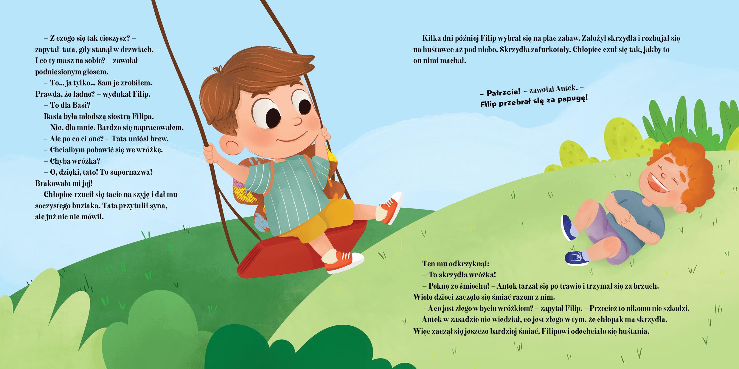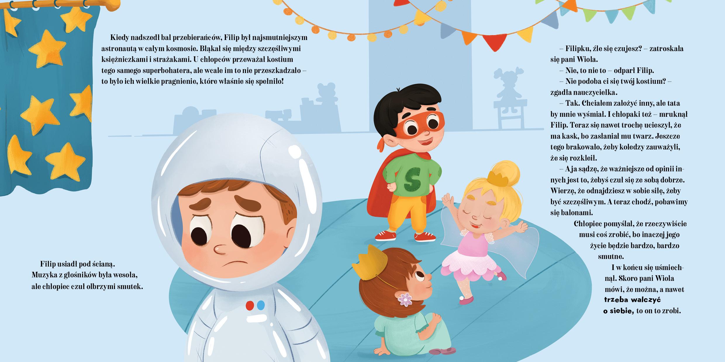 Filip marzył, by na bal przebrać się za wróżka. Niestety tata nie rozumiał tego pomysłu – chłopcy przecież nie przebierają się za wróżki… Prawda? Ostatecznie Filip poszedł w stroju astronauty. Na balu był smutny. Pewnego dnia sam zrobił sobie skrzydła. Ubrał się tak, jak zawsze chciał. I choć niektórzy się śmiali – on był szczęśliwy. Inne dzieci zaczęły się z nim bawić udając wróżki i wróżków. A gdy młodszej siostrze Filipa wypadł ząb i zębuszka nie przyszła… założył skrzydła i został wróżką zębuszką. Rodzice nie mogli powstrzymać wzruszenia. „Czytam dziecku codziennie” to wyjątkowa seria stworzona z myślą o codziennym rytuale rodzinnego czytania. Pełne ciepła, emocji i wartościowych przesłań opowieści, które pomagają rozwijać wrażliwość, wyobraźnię i ciekawość świata. Wspólne czytanie buduje bliskość, jest świetną bazą do rozmów na różne tematy i tworzenia wspomnień, które zostają na całe życie. Czytaj dziecku codziennie – rozbudź w nim miłość do książek!Szczegółowe informacje na temat książki Czytam dziecku codziennie. Filip chce zostać wróżkiem