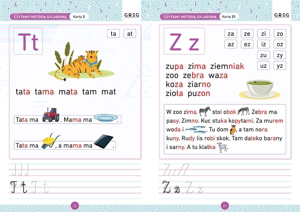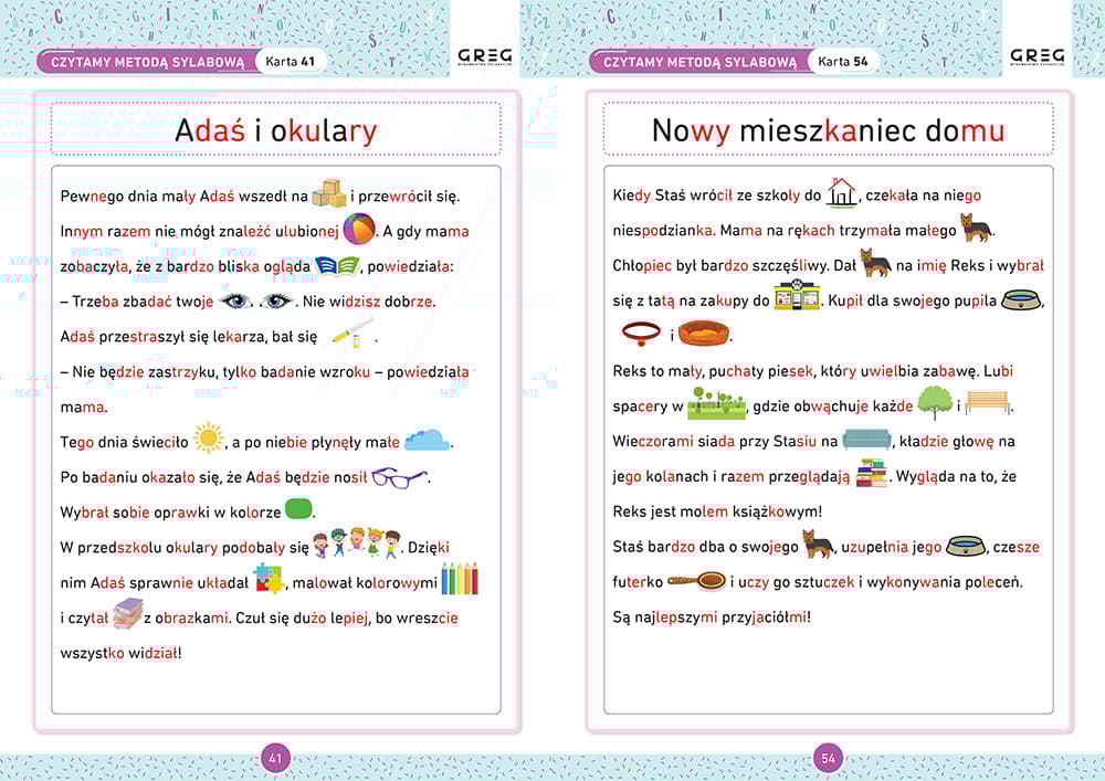 Karty pracy są kolorowe, bogato ilustrowane, atrakcyjne wizualnie, zachęcają do pracy. Zostały też przygotowane tak, by przy kserowaniu na czarno-białej kopiarce strony nie traciły czytelności i estetycznego wyglądu. Gorąco polecamy!