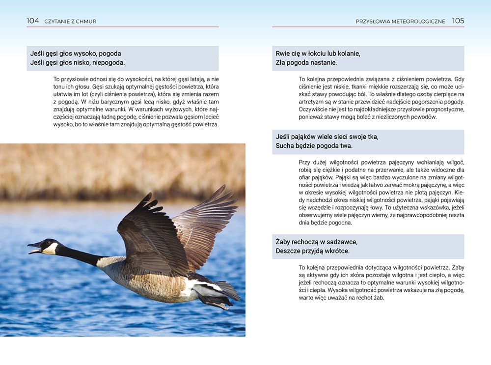 Czy nie byłoby wspaniale móc precyzyjnie przewidywać pogodę po prostu patrząc na chmury? Dzięki tej książce to ci się uda! Zrozumiesz dlaczego chmury są oznakami procesów pogodowych, a nie ich przyczynami. Obserwując je i odnosząc do zilustrowanych kolorowymi fotografiami wyjaśnień, odkryjesz dokładnie co te oznaki zwiastują. Prognozy telewizyjne i te z internetu oraz aplikacje na smartfony, wszystkie korzystają z tych samych danych – to numeryczny obraz tego, jak ciśnienie i temperatura powietrza wpływają na pogodę nad dużym obszarem geograficznym. Jednak, aby sprawdzić jak pogoda rozwinie się w konkretnej lokalizacji, gdzie akurat stoisz lub chodzisz, żeglujesz czy łowisz ryby, nie potrzebujesz żadnego sprzętu lub dostępu do Wi-Fi – wystarczy spojrzeć w górę. Ten podręczny przewodnik po chmurach dla wszystkich, w dowolnej części świata, na wodzie lub na lądzie, pozwoli ci przewidywać pogodę dzięki rozpoznawaniu typów chmur, ich kształtów, kolorów i zachowania. Jest nieocenioną pomocą dla wszystkich, którzy spędzają czas na świeżym powietrzu.Szczegółowe informacje na temat książki Czytanie z chmur Jak przewidywać pogodę
