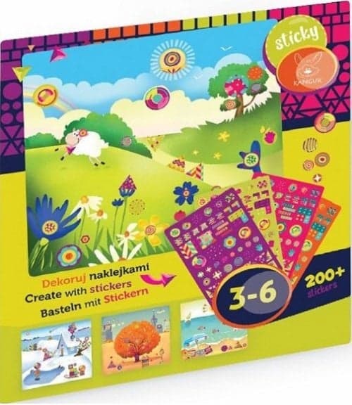 Wesoła i kreatywna zabawa dla najmłodszych. Dekoruj pięknymi naklejkami 12 kart przedstawiających pory roku i spraw by wyglądały jeszcze piękniej. Wykorzystaj ponad 200 naklejek. Wiek 3-6 lat