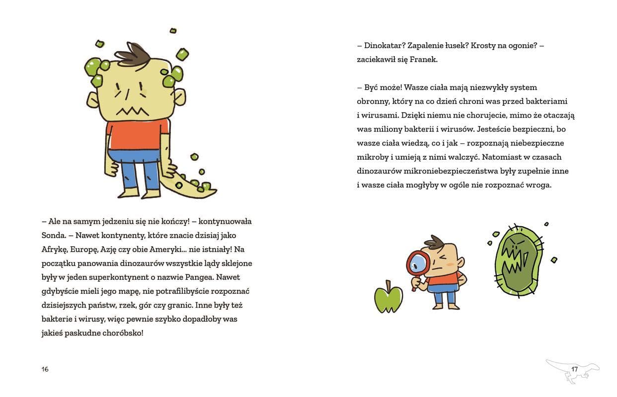 Dzieciaki zadadzą całe mnóstwo niecodziennych pytań, na które cierpliwie odpowiadać będzie Sonda, ich zaawansowana technologicznie przewodniczka i towarzyszka zabaw. Jeżeli chcecie się dowiedzieć czy moglibyście żyć w czasach dinozaurów, jak uciec przed t-rexem albo czy dinozaury potrafiły śpiewać to jest to książka dla was!