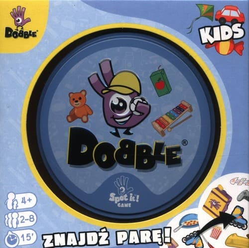 Spójrz na pierwszą kartę, którą trzymasz w ręku oraz na tę, która leży na środku stołu. Znajdź na nich wspólny symbol, nazwij go i szybko pozbądź się swojego kartonika. Teraz następny! Tylko nie zwątp, każda karta łączy się z inną zawsze tylko jednym symbolem! Dobble Kids to gra wspierająca trening spostrzegawczości i szybkości reakcji, w pełni dostosowana do potrzeb najmłodszych. Zestaw zawiera 55 kart z symbolami przedstawiającymi przedmioty i zabawki, którymi dzieci bawią się każdego dnia. Miś, plecak, piłka, rower, lalka – proste obrazki łatwiej nazwać, dzięki czemu możemy zaprosić do zabawy dzieci od 4. roku życia. zawartość pudełka: 55 okrągłych kart puszka instrukcja Wiek: 4+ 2-8 graczy Czas: 15 minut