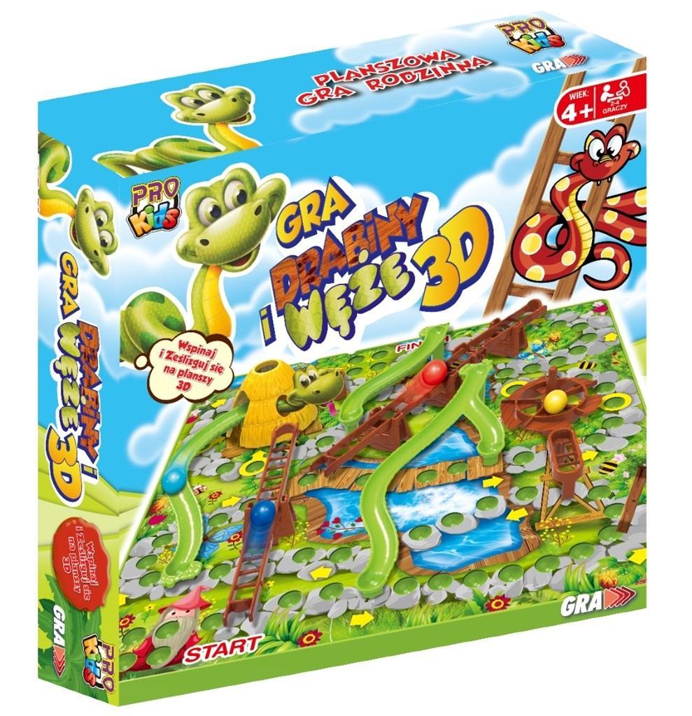Wspaniała i popularna gra "Drabiny i Węże". W zestawie znajduje się plansza, po której poruszamy się specjalną kulką. Każdy z graczy ma własny kolor kulki. Po żucie kostką gracz porusza się o wyrzuconą ilość oczek. Gdy nasza kulka wejdzie na specjalne miejsce, może się poruszyć do przodu dzięki drabinie lub w dół gry wejdziemy na węża. Plansza jest ustawiona w trzech wymiarach więc gdy wejdziemy na specjalne miejsce kulka sama przemieści się po planszy. Super gra dla całej rodziny z ogromną ilością śmiechu i zabawy.