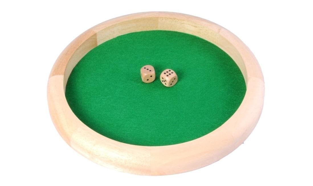 Tacka wykonana z drewna kauczukowego z intarsjowanym zielonym filcem, w zestawie 2 drewniane kostki. Średnica planszy: 29 cm. Wymiary kostek: 18 mm.