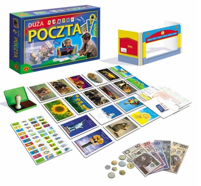 To znakomita zabawka edukacyjna. Składa się na nie wiele atrakcyjnych rekwizytów związanych z pracą na poczcie. Bawiąc się w pocztę dzieci poznają zasady adresowania listów i pocztówek. Dowiedzą się jak wypełnić druk na przekaz bankowy lub wpłatę gotówkową, czy też adres pomocniczy na list polecony. Te i inne czynności sprawią, że dzieci poznają na czym polegają usługi świadczone przez pocztę. Zawartość pudełka: okienko pocztowe, 5 nominałów po 12 sztuk, pieczątka z poduszką dwukolorową, bilon, 18 pocztówek, 10 kopert, 88 znaczków, druki pocztowe. Wiek: 6+
