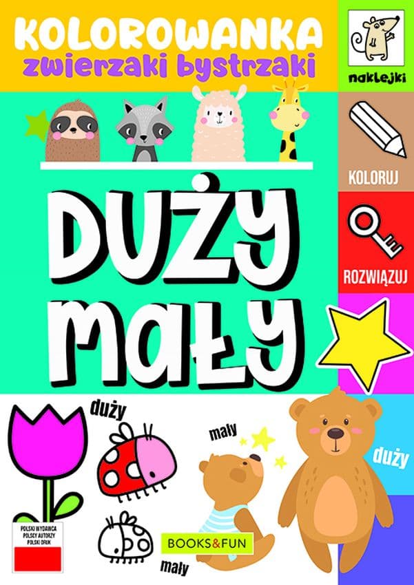 Zwierzaki bystrzaki. Duży – mały to kolorowanka, w której dzieci mogą poćwiczyć rozpoznawanie i opisywanie wielkości przedmiotów oraz porządkowanie ich zgodnie z rozmiarem. Rozwiązując proste zadania, kolorując obrazki i naklejając naklejki, będą się uczyć i bawić.