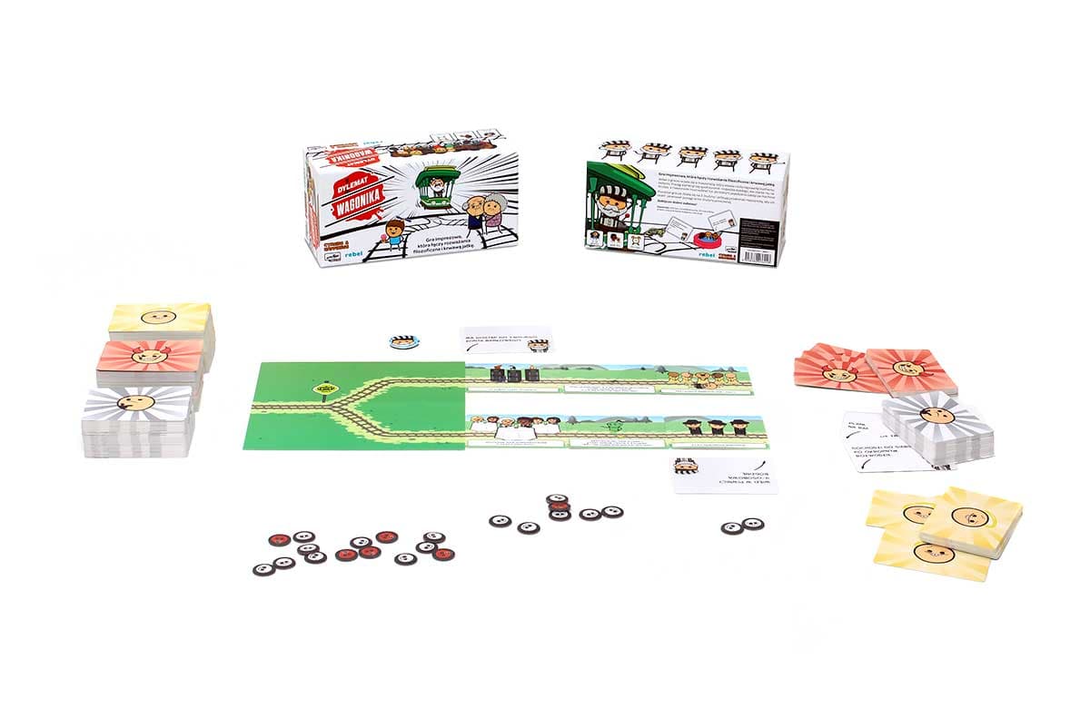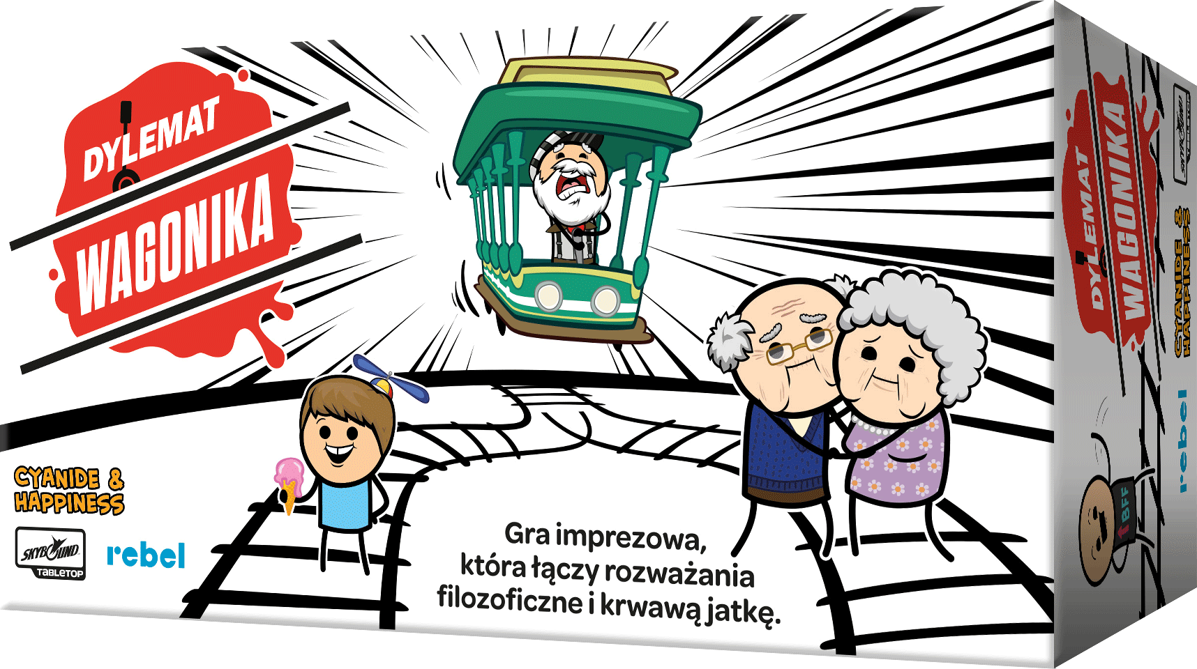 Uwaga. Gra imprezowa przeznaczona dla osób pełnoletnich. Rozważania filozoficzne i krwawa jatka w jednym! Karol Kolejarz nie spodziewał się kłopotów – dzień pracy zapowiadał się spokojnie. Przynajmniej do czasu, gdy kierowany przez niego pociąg nieco wymknął się spod kontroli. Pędząca przed siebie śmiercionośna maszyna zbliża się do rozwidlenia, nasz bohater musi zdecydować, w którą stronę skręcić, a tymczasem na każdym z torów znajdują się niczego nieświadomi ludzie... Dylemat wagonika łączy filozoficzne rozważania z krwawą jatką i zmusza uczestników do podejmowania trudnych moralnie decyzji. Na czym to polega? W każdej rundzie jeden z uczestników wciela się w maszynistę – to jego zadaniem będzie podjęcie decyzji, po którym z torów przejedzie morderczy pociąg. W tym czasie pozostali gracze, podzieleni na dwie drużyny, będą starali się przekonać go do przestawienia zwrotnicy i uśmiercenia tych, którzy znajdują się na TYM DRUGIM torze. W tym celu będą wykorzystywali karty nieskazitelnych postaci, plugawych postaci oraz modyfikatorów - dobrych i złych czynów, których dokonali ludzie uwięzieni na torach. Wszystko byleby uratować "swoich". Ostateczna decyzja należy oczywiście do maszynisty, który, gdy karty zostaną zagrane, będzie musiał odpowiednio przestawić zwrotnicę. Każdy gracz z drużyny, której tor stał się miejscem zbrodni, otrzymuje znacznik śmierci jako przypomnienie o plamie na sumieniu. A następnie zamieniamy się rolami! Zawartość: 500 kart rozwidlenie torów 26 znaczników śmierci znacznik Karola Kolejarza instrukcja Wiek 16+ Liczba graczy 3-13 Czas gry 15 minut