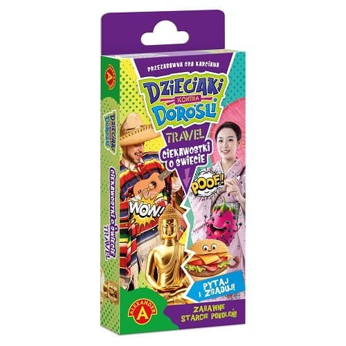 "Jaki jest sport narodowy w Hiszpanii? Z jakiego kraju pochodzi tort Sachera? Gdzie żyje najwięcej wilków? Czy jesteście gotowi na wyjątkowe starcie pokoleń w przezabawnej grze karcianej? ""Dzieciaki Kontra Dorośli – Ciekawostki o Świecie Travel” to gra planszowa, która zapewni świetną zabawę całej rodzinie. Dzieci rywalizują z dorosłymi, odpowiadając na podchwytliwe pytania dotyczące światowych ciekawostek. Dzięki dwóm oddzielnym zestawom kart z pytaniami o innym poziomie trudności dedykowanym dzieciom oraz rodzicom, szanse na wygraną są takie same dla obu drużyn. Kto okaże się lepszy? Gra pełna śmiechu i emocji, idealna na wspólne rodzinne wieczory oraz imprezy w większym gronie. Rozgrywkę można przeprowadzić zarówno przy udziale tylko dwóch graczy jak i w pojedynku drużynowym. Gra ""Dzieciaki Kontra Dorośli – Ciekawostki o Świecie Travel” to doskonały sposób na naukę poprzez zabawę. Dzieci i dorośli mogą poszerzyć swoją wiedzę oraz rozwijać zarówno umiejętności współpracy jak i zdrowej rywalizacji. Wspólna zabawa wzmocni więzi rodzinne, zapewniając jednocześnie mnóstwo radości. Wyjątkowy, poręczny format opakowania, pozwoli na zabranie gry ze sobą dosłownie wszędzie. Idealnie zmieści się do każdego plecaka oraz torebki, umilając wspólne wypady. Wiek graczy: 8+ Liczba graczy: 2+