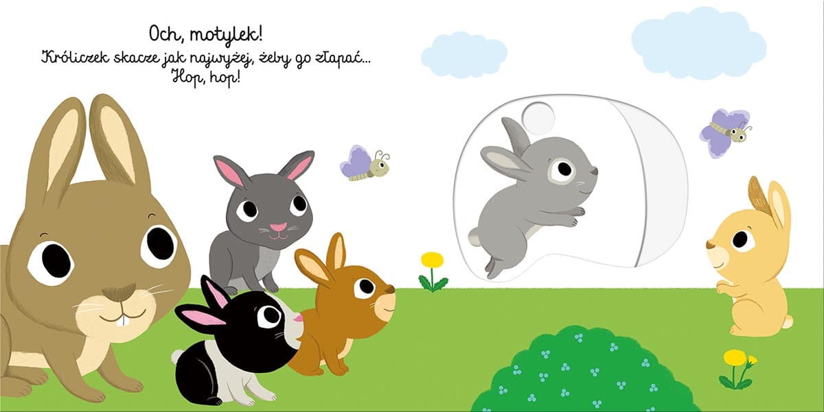 To kolejna książeczka w serii Pierwsze bajeczki. Opowiada o rodzinie króliczków. Małe króliczki bawią się razem i skaczą, a po wyczerpującym dniu zasypiają wtulone w mamę w króliczej norce. Pierwsze bajeczki to seria książeczek dla dzieci i rodziców do wspólnego oglądania i czytania. Ruchome elementy doskonale wspierają rozwój maluchów i rozwijają ich sprawność manualną. Piękne kolorowe ilustracje sprawiają, że dzieci z przyjemnością odkrywają świat wokół siebie.