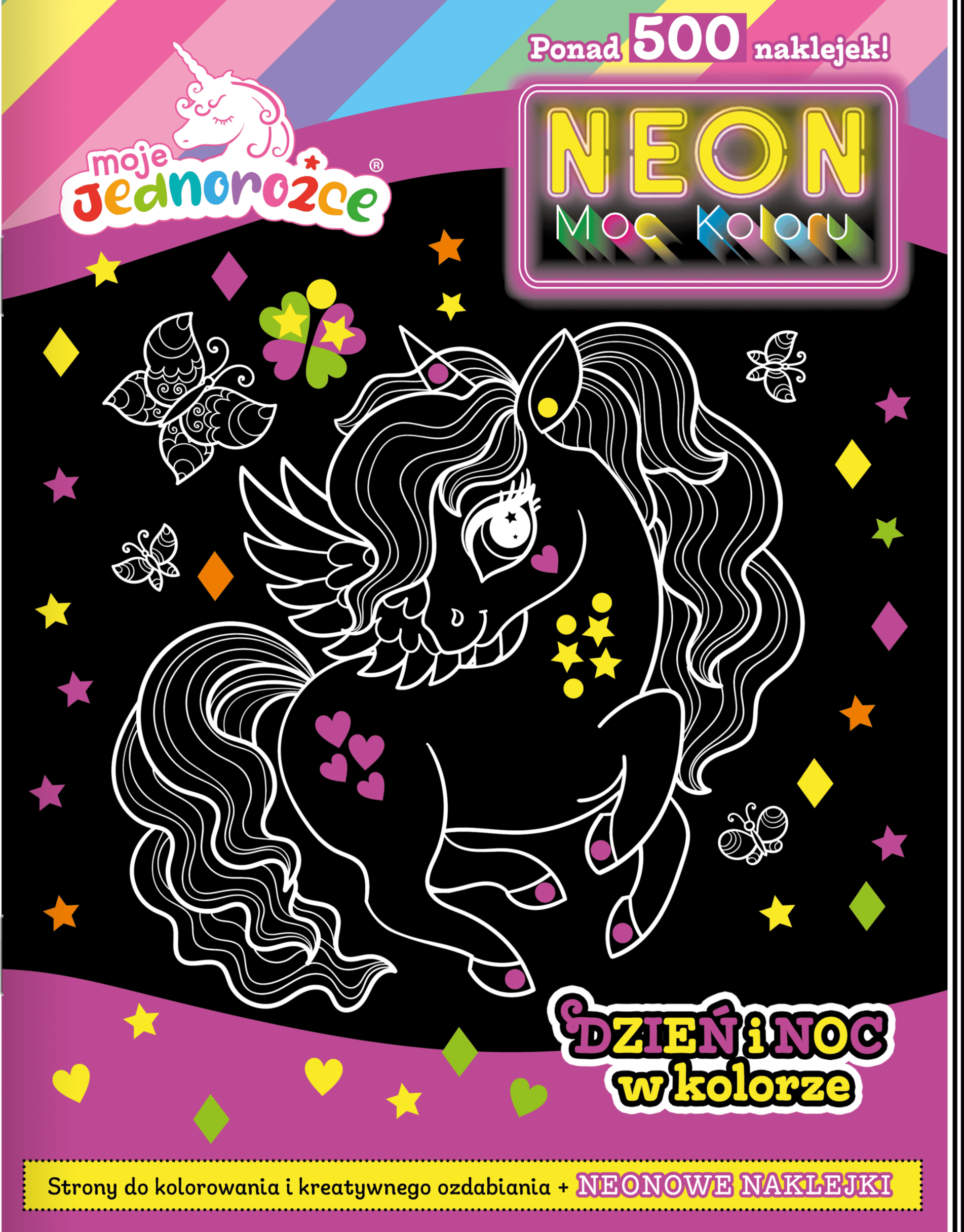 Moje Jednorożce. Neon moc koloru. Książka z obrazkami i z ponad 500 neonowymi naklejkami do tworzenia wyjątkowych, kreatywnych prac w środku strony do kolorowania i kreatywnego ozdabiania. Każda strona to nowa przygoda z magicznymi jednorozcami! Twórz wyjątkowe i kreatywne prace! Koloruj bohaterów i wyklejaj strony neonowymi naklejkami. Efekt końcowy cię zaskoczy!