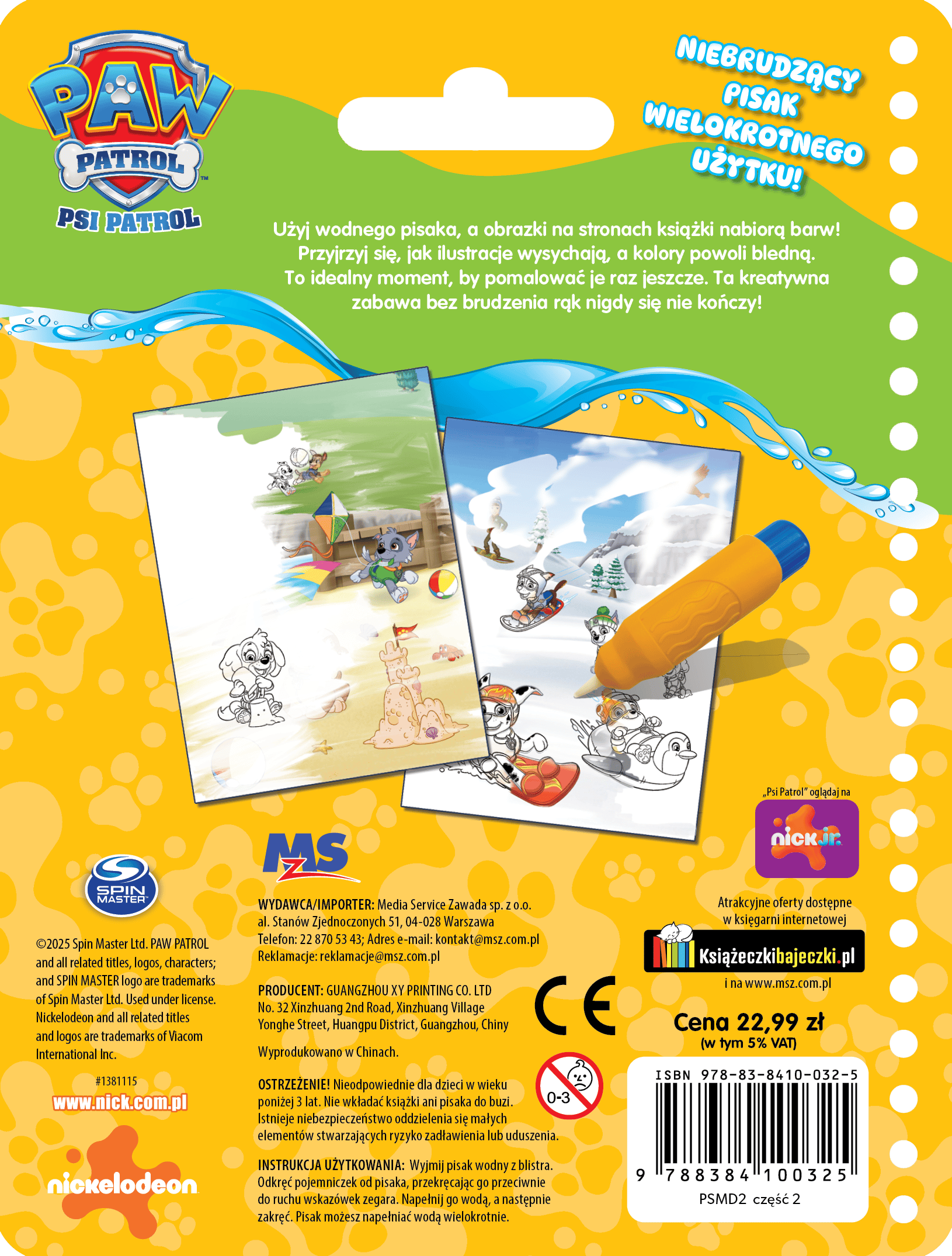 Wystarczy napełnić specjalny pisak wodą i… malować! Na stronach książki pojawią się kolorowe obrazki z ukochanymi postaciami – jak za dotknięciem czarodziejskiej różdżki. Po wyschnięciu kolory znikają, więc książkę można używać wielokrotnie!