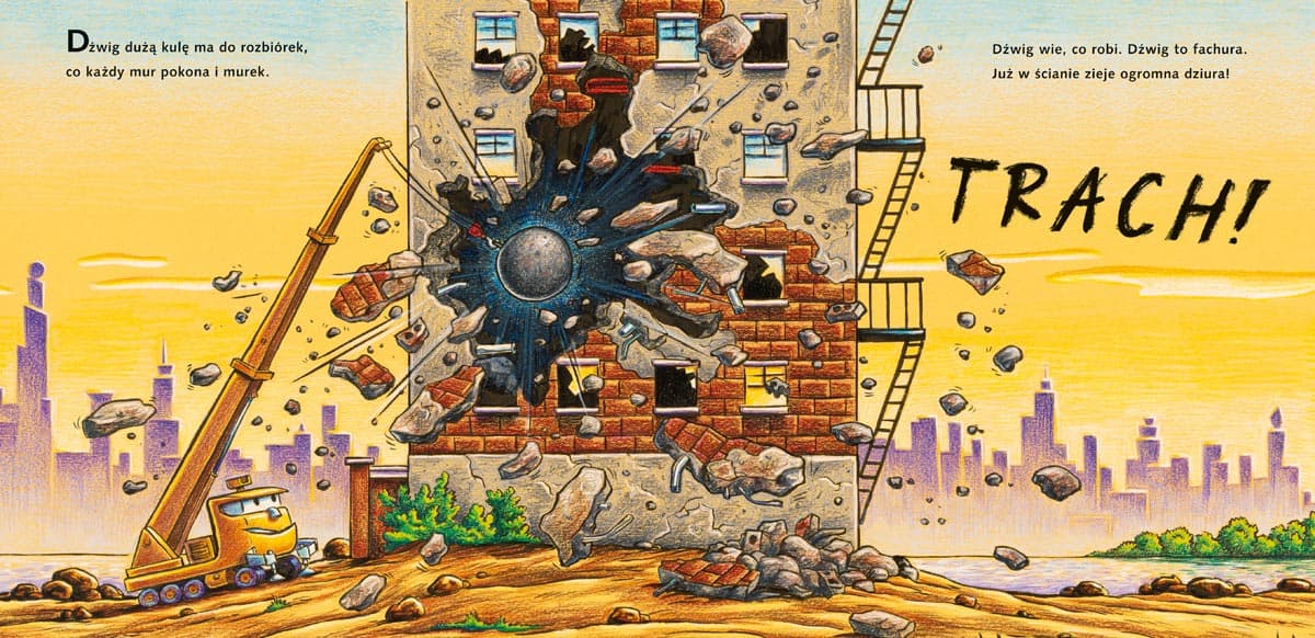 Kontynuacja książeczki na dobranoc, którą pokochały dzieci na całym świecie! Dźwig porządnie się dziś namacha swoją kulą. Wielkie maszyny z placu budowy i ich mała przyjaciółka – Brumka Brzdąc – muszą zburzyć opuszczony dom, który od dawna popada w ruinę. Czy jednak w rozbiórce chodzi tylko o rozwalanie, hałasowanie i robienie strasznego bałaganu? Nic z tych rzeczy – nawet w Dniu Demolki można zadbać o planetę. Auta już wkrótce się przekonają, że kupa gruzu to nie śmieci, a segregacja surowców jest dobrą zabawą – szczególnie w dobrym towarzystwie!