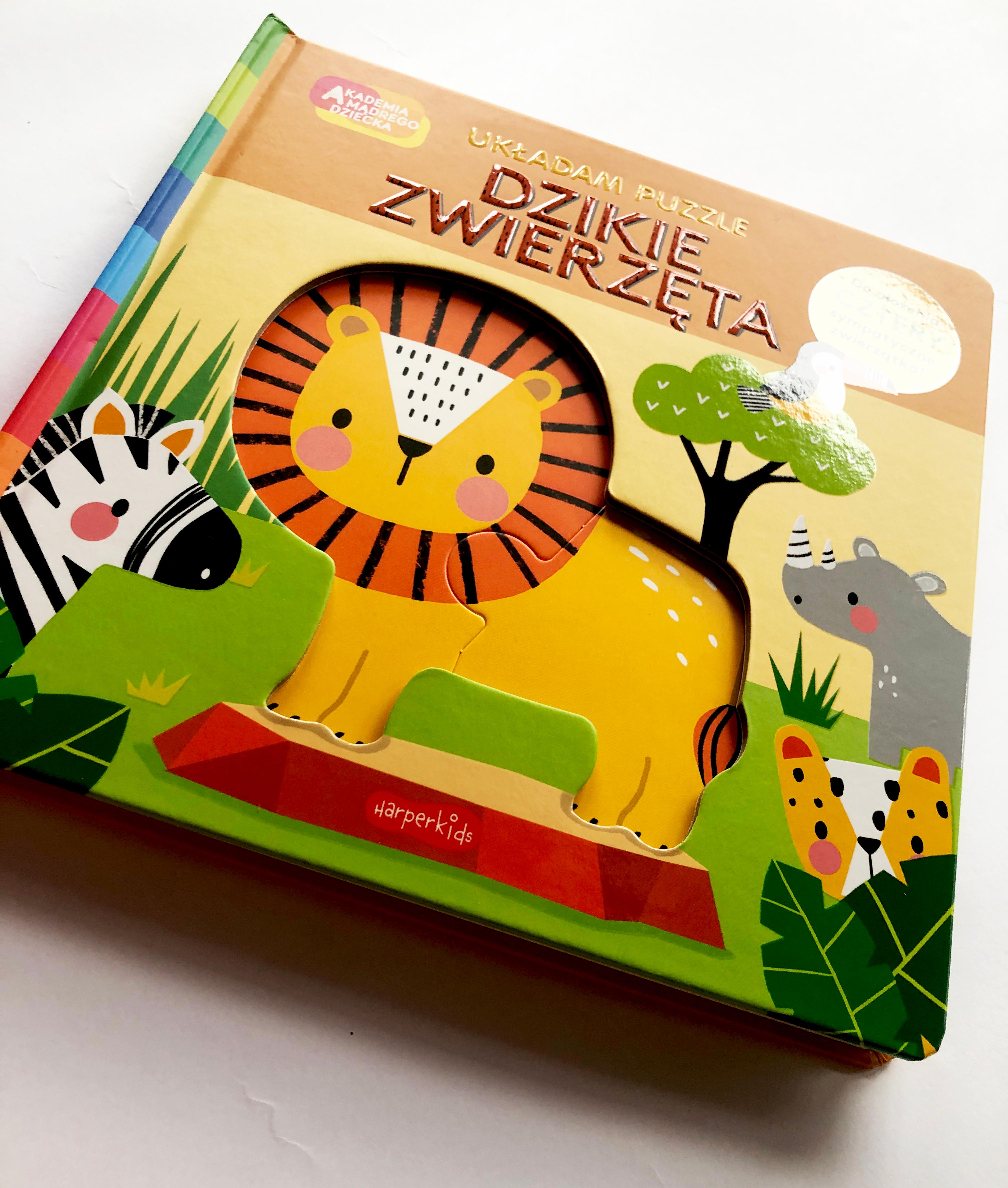 Dzikie Zwierzęta, to kolejna kartonowa nowość w serii Układam puzzle. Akademii Mądrego Dziecka, która zachęca do czytania i wspólnej zabawy rodzica z dzieckiem. Książeczka opowiada o zwierzętach żyjących na sawannie. Poznajemy lwa, który wieczorem wyrusza na polowanie, zebrę, która potrafi się świetnie kamuflować dzięki czarno-białym paskom, słonia, który trąbą pije wodę oraz małpkę skaczącą po drzewach. Każde z tych zwierzątek występuje jako puzzel składający się z dwóch elementów. Po wyjęciu i ułożeniu puzzli możemy je rozsypać i próbować układać na nowo. Inną propozycją jest kolorowanie. Ułóż puzzla na kartce i odrysuj krawędzie zwierzątka, następnie wspólnie z dzieckiem pomalujcie je kredkami lub farbkami.