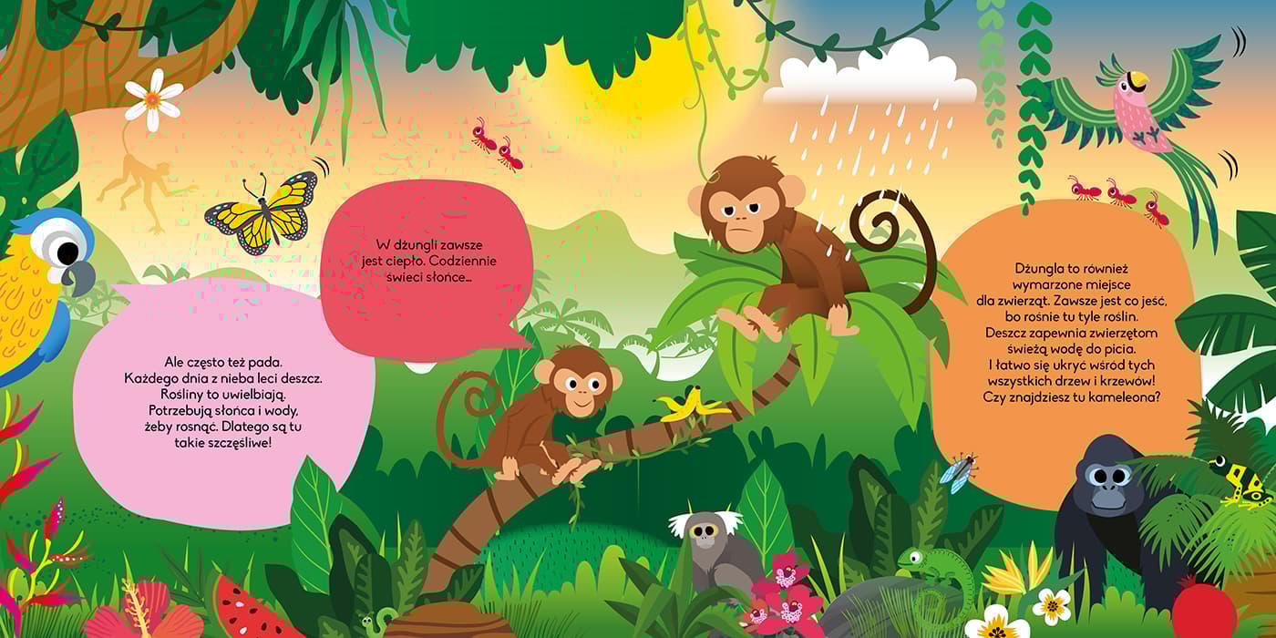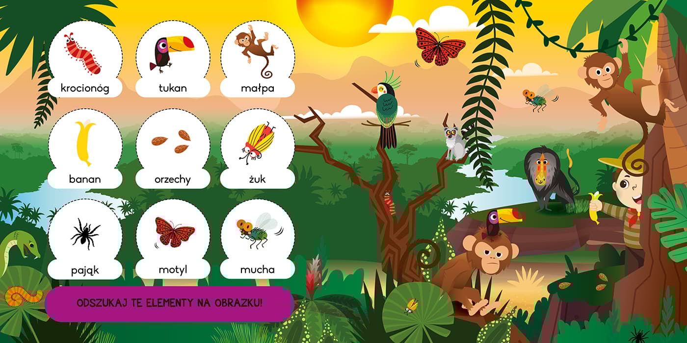 Kto z was ma ochotę na wyprawę do dżungli i wnikliwe obserwowanie niesamowitych roślin, jakie tam rosną, i egzotycznych zwierząt, jakie tam żyją?... Och, jak wielu chętnych! To wspaniale, że jesteście zainteresowani, bo ta pomysłowa książka, wyposażona w latarkę, umożliwi wszystkim małym podróżnikom eksplorowanie nawet najbardziej tajemniczych zakątków lasów tropikalnych. Wystarczy jeden ruch „latarki” po specjalnie zadrukowanej folii i będziemy mogli obserwować zielonego krokodyla, psotną małpkę, bajecznie kolorowe kwiaty i wiele innych kuszących obiektów. Każdy element, który będziemy podziwiać, został opatrzony ciekawym i przykuwającym uwagę komentarzem – wszystko po to, by świetna zabawa w wyszukiwanie szła w parze z poznawaniem fascynującego świata przyrody. A zatem, latarki w dłoń! Pora odkryć zadziwiający świat dżungli.