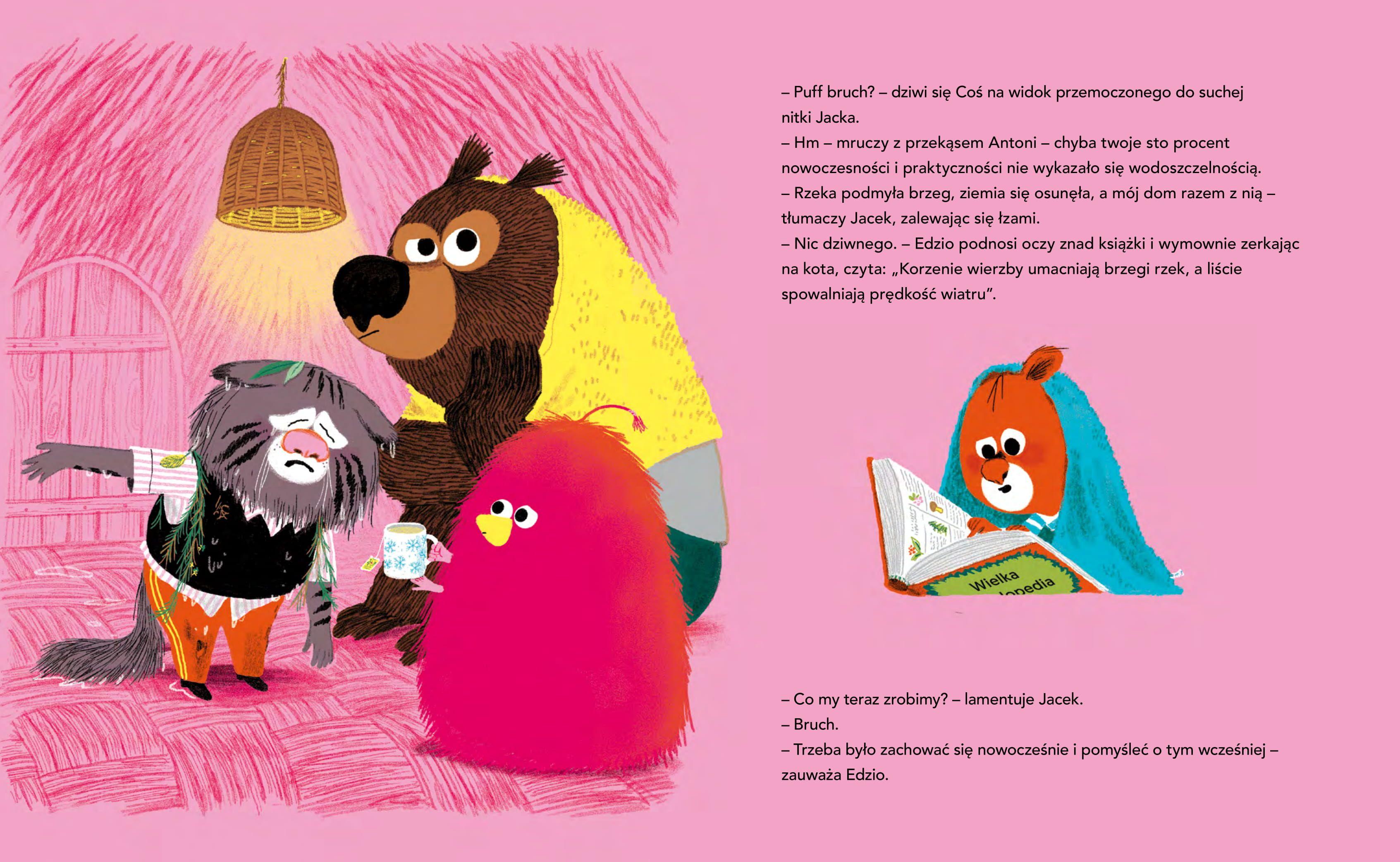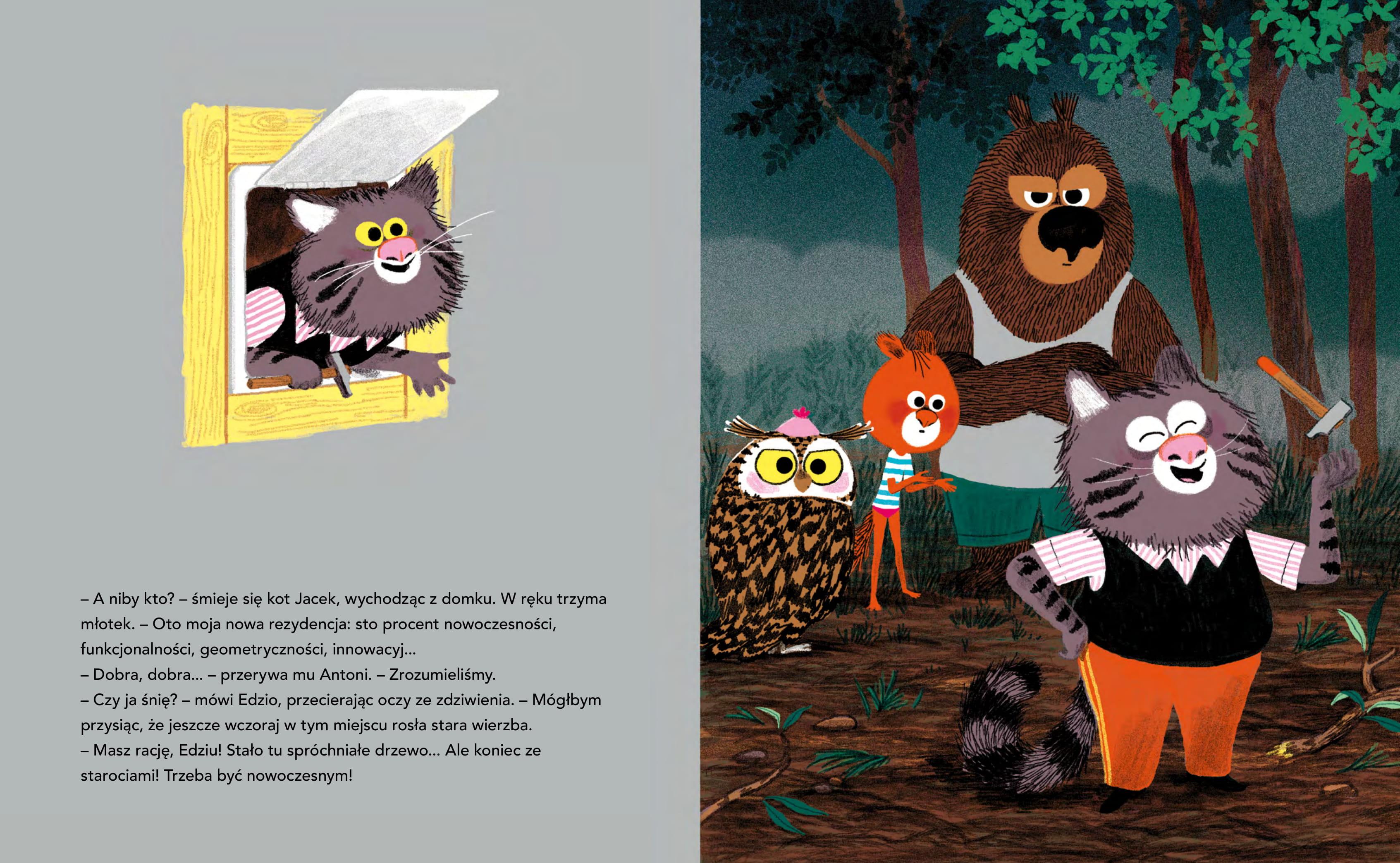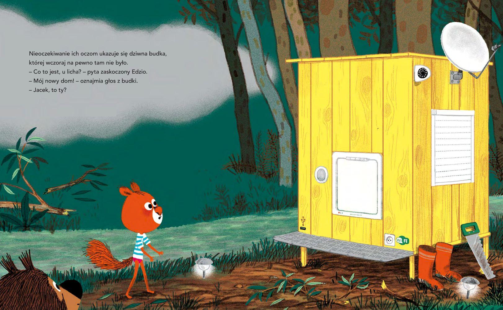 Spokojny sen mieszkańców polany przerywa głośne stukanie. Podążając za hałasem, miś Antoni, puchacz Jerzy i wiewiórek Edzio odkrywają nad rzeką dziwną budkę, której dzień wcześniej jeszcze tam nie było! To nowy dom kota Jacka. Sęk w tym, że rezydencja stanęła w miejscu starej wierzby. Edzio i jego przyjaciele przecierają oczy ze zdumienia. Czy kot Jacek wyciął drzewo? I jeszcze mówi, że to duch nowoczesności i postęp? Przyjaciele Edzia znajdą sposób i sprzymierzeńca w złej pogodzie, by uświadomić mu, że życie zgodnie z przyrodą i duchem lasu to nowoczesność. To już siódma część historii Edzia i jego przyjaciół. Pojawia się nowy bohater ? kot Jacek! Ta historia jest o tym, że czasami robimy coś bez żadnej refleksji i nie bacząc na skutki. Na szczęście mamy przyjaciół, którzy pomogą, podpowiedzą… A my dzięki temu czegoś nowego się nauczymy, np. po co są drzewa i jak nasze działania wpływają na przyrodę.Przedział wiekowy: 3+