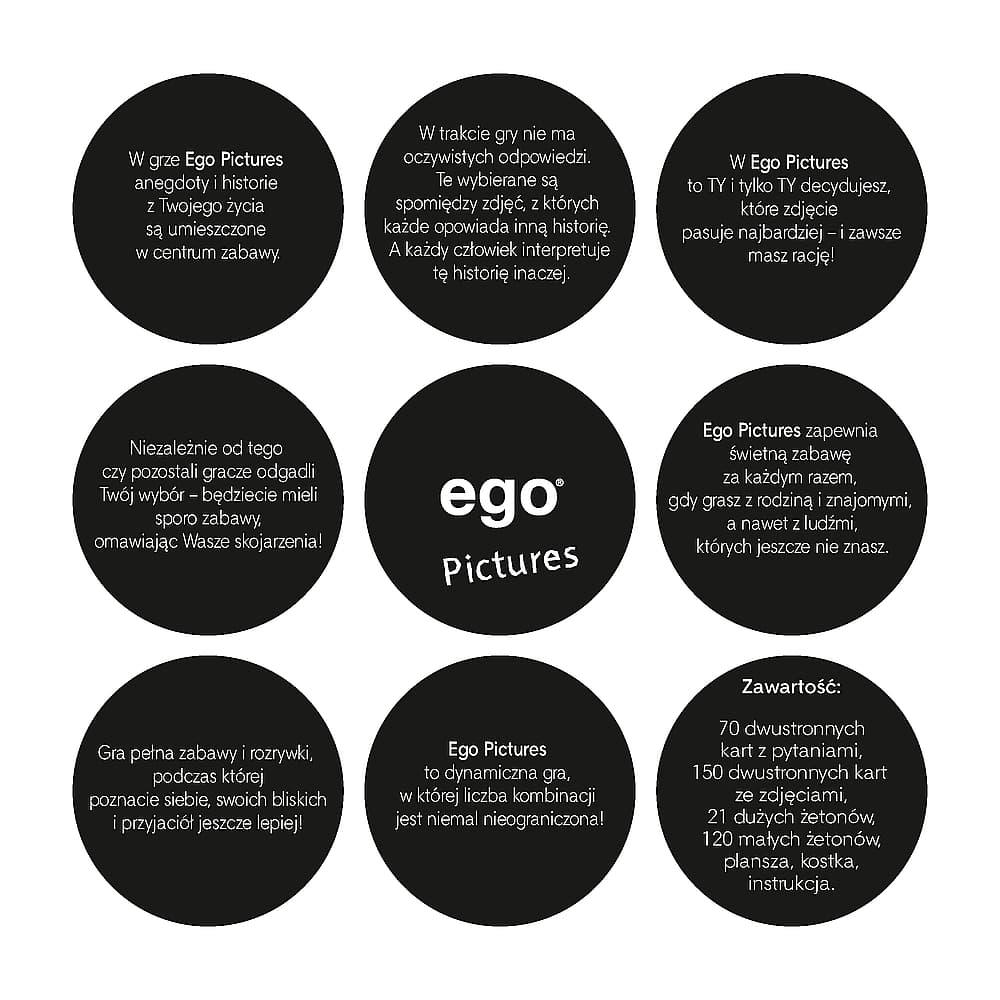 W grze Ego Pictures anegdoty i historie z Twojego życia są umieszczone w centrum zabawy. W trakcie gry nie ma oczywistych odpowiedzi. Te wybierane są spomiędzy zdjęć, z których każde opowiada inną historię. A każdy człowiek interpretuje tę historię inaczej. W Ego Pictures to TY i tylko TY decydujesz, które zdjęcie, pasuje najbardziej i zawsze masz rację. Niezależnie od tego czy pozostali gracze odgadli Twój wybór – będziecie mieli sporo zabawy, omawiając Wasze skojarzenia. Gra pełna zabawy i rozrywki, podczas której poznacie siebie, swoich bliskich i przyjaciół jeszcze lepiej. EGO Pictures zapewnia świetną zabawę za każdym razem, gdy grasz z rodziną i znajomymi, a nawet z ludźmi, których jeszcze nie znasz. Zawartość: - 300 zdjęć, - 150 kart słownych po 3 słowa / dylematy, - 18 czarnych odpowiedzi, - 3 białe żetony, - 120 małych żetonów, - kość kategorii, - instrukcja. Wiek 14+
