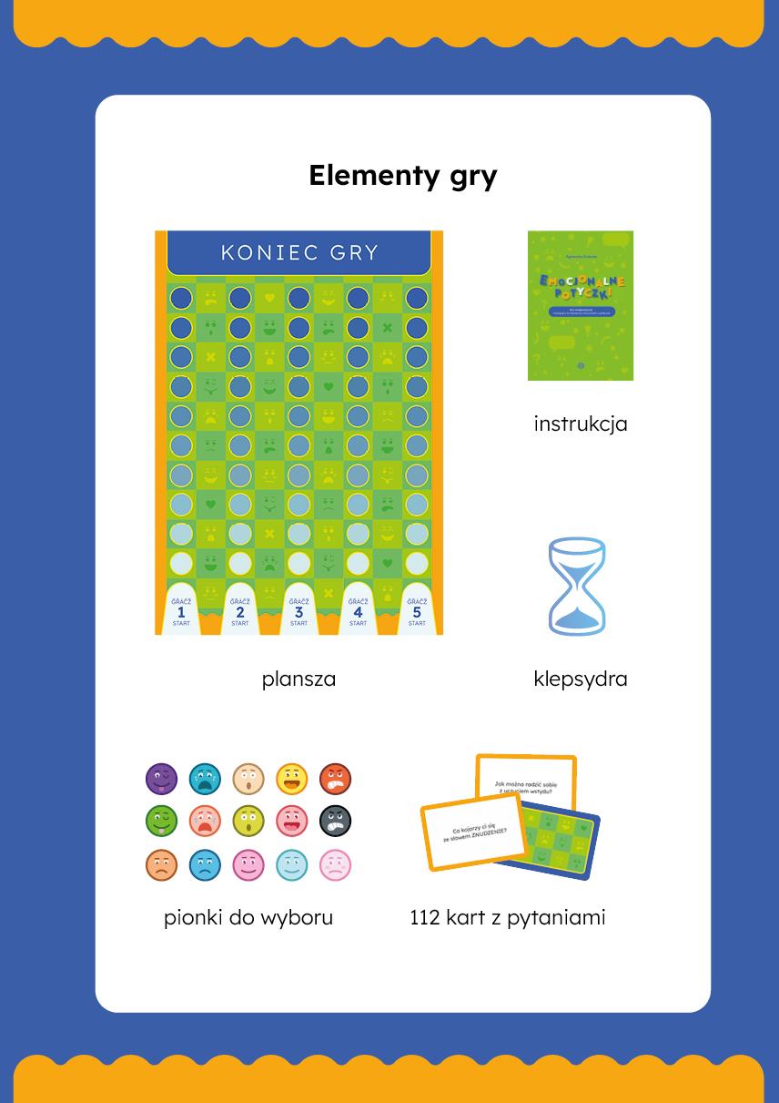 „Emocjonalne potyczki” to gra planszowa opracowana przede wszystkim dla uczniów z trudnościami w rozpoznawaniu, nazywaniu i wyrażaniu emocji. Doskonale sprawdzi się w pracy specjalistów prowadzących zajęcia z dziećmi w wieku szkolnym: psychologów, nauczycieli i trenerów TUS. Może być także świetną pomocą dla rodziców szukających wartościowych sposobów spędzania wolnego czasu z dziećmi. W czasie gry uczestnicy: ćwiczą rozpoznawanie różnych stanów emocjonalnych u siebie i innych uczą się, jak wyrażać emocje w sposób jasny i zdecydowany, ale zawsze z szacunkiem dla innych zastanawiają się, skąd się biorą emocje i w jakich sytuacjach zdarza się im przeżywać rozmaite z nich uczą się empatii, przyjmowania perspektywy innych i akceptacji tego, że jesteśmy różni. Gra przeznaczona jest dla 2–5 osób. W skład zestawu wchodzą: plansza do gry w formacie A3 112 kart z pytaniami zestaw pionków-żetonów do wyboru klepsydra zeszyt z opisem gry i omówieniem merytorycznym.